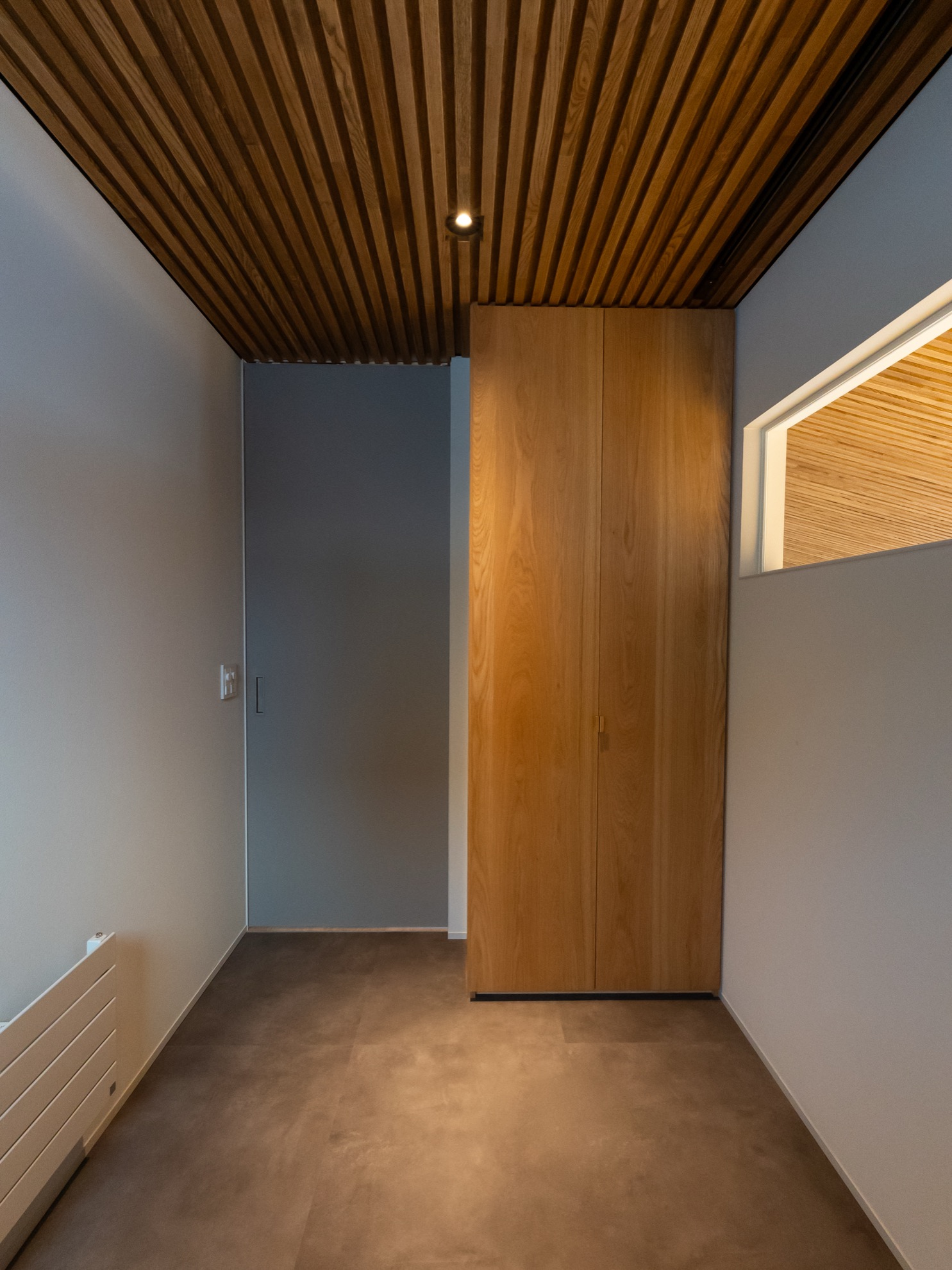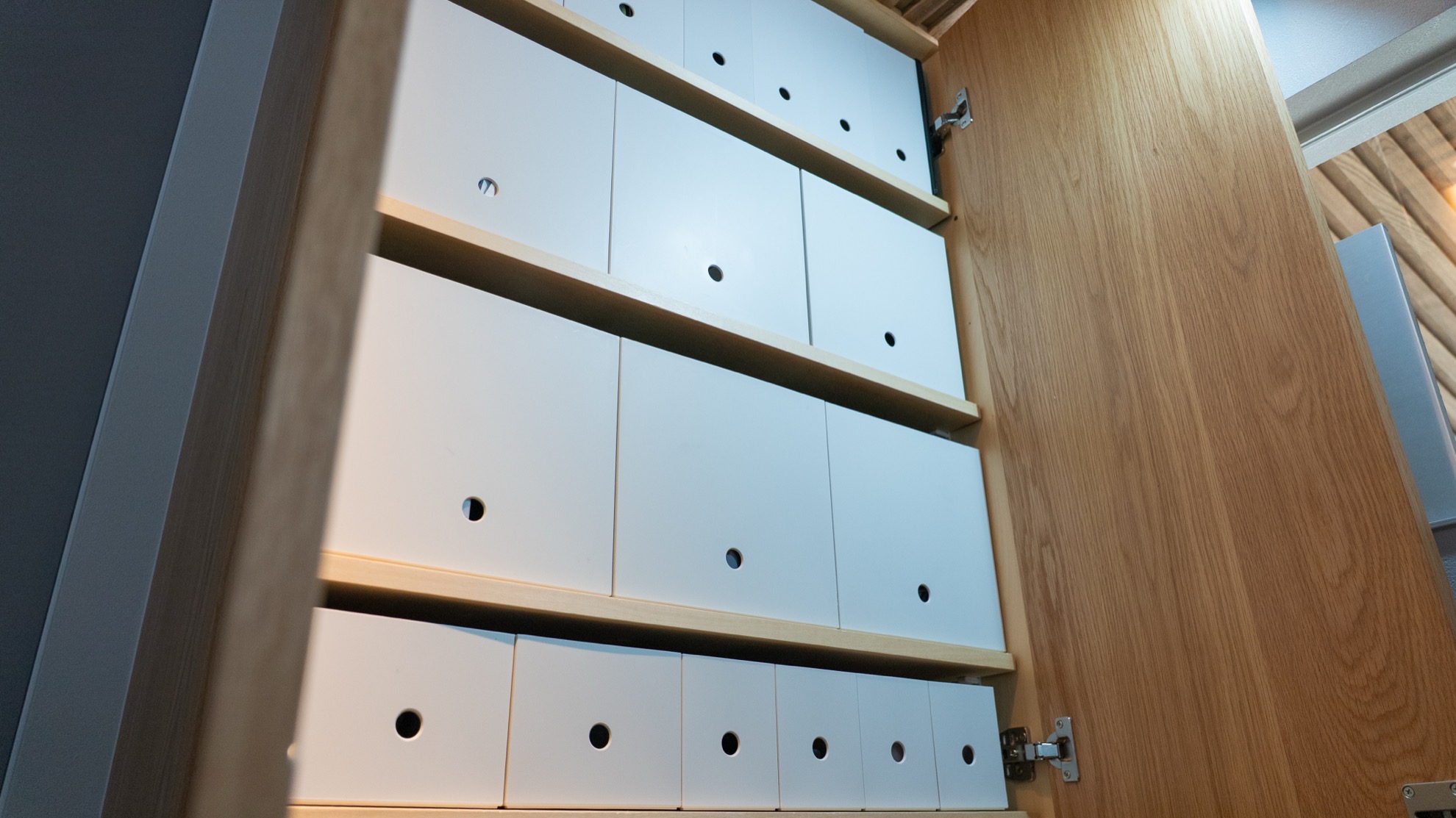 デスクの後ろには造作ロッカーがあり、その扉を開けると自動的にライトが点灯するようになっています。ロッカーを開けると手元を照らしてくれるので、とても快適です。