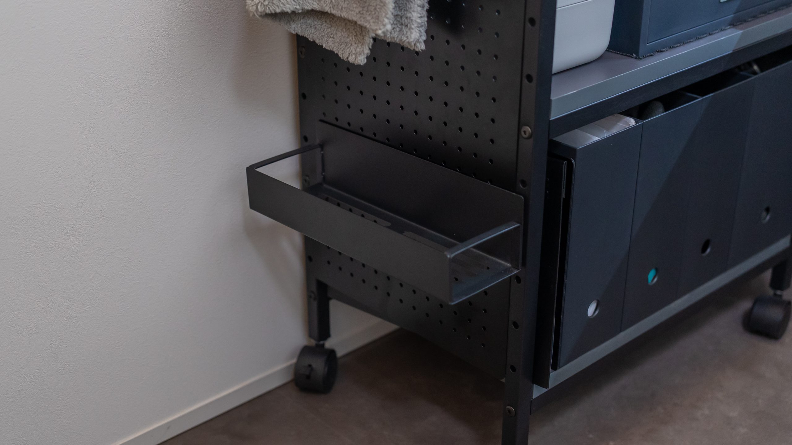 サイドには、マグネットラックを取り付けています。スチール有孔ボードを取り付けたことにより、このように簡単に収納を拡張する事ができるようになりました!ここには、一時的に置くものなどを収納しています。