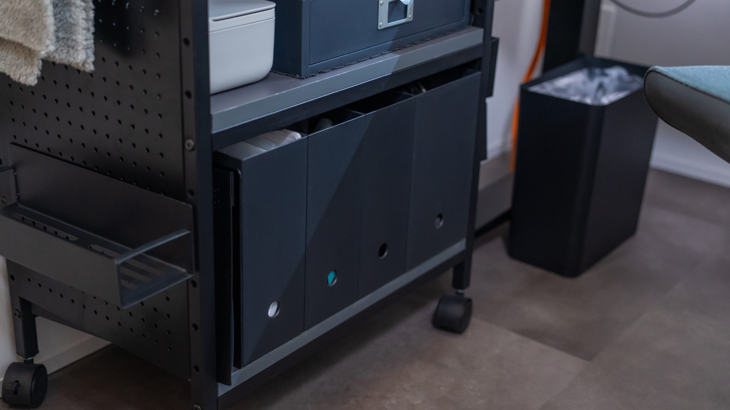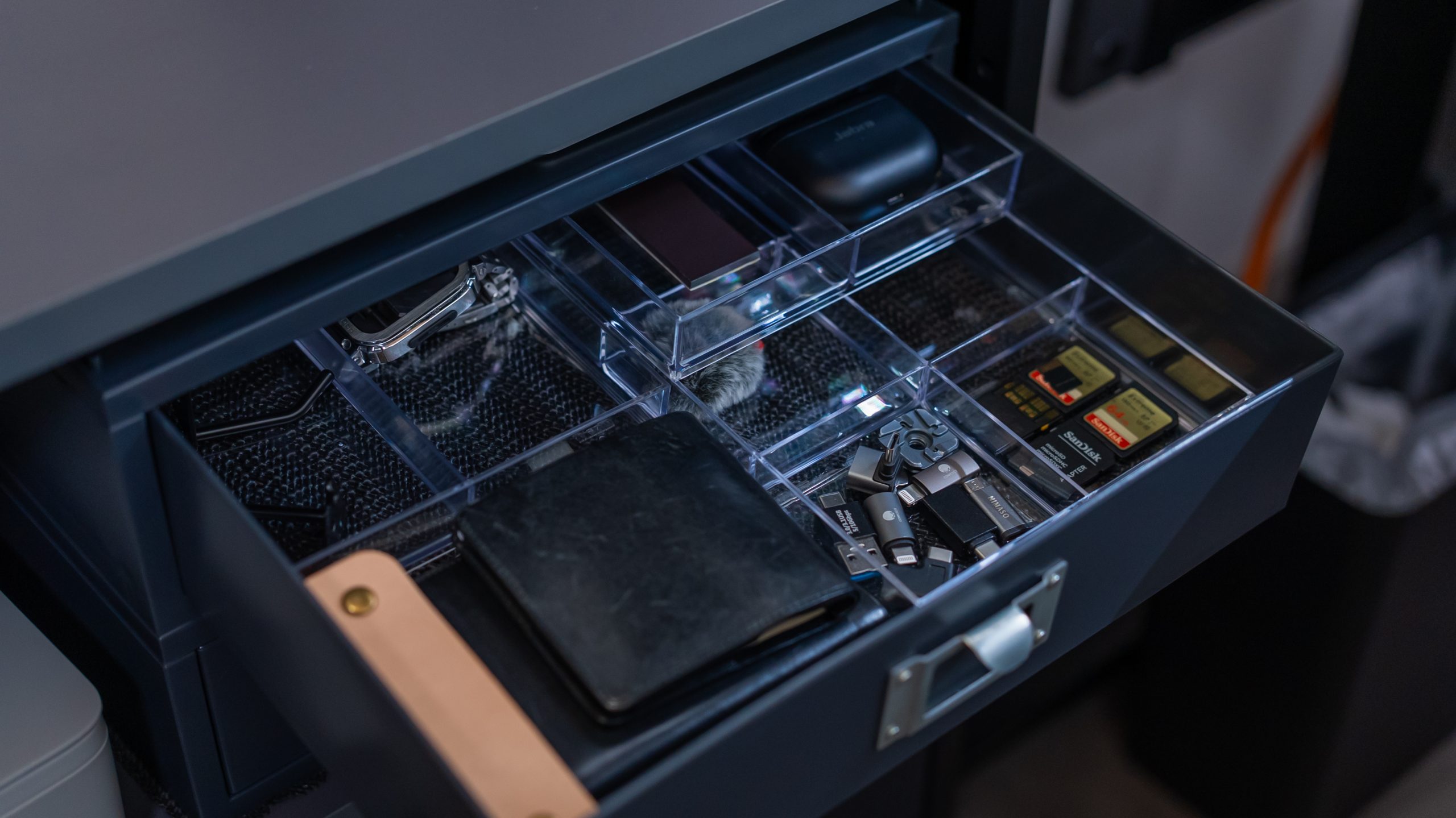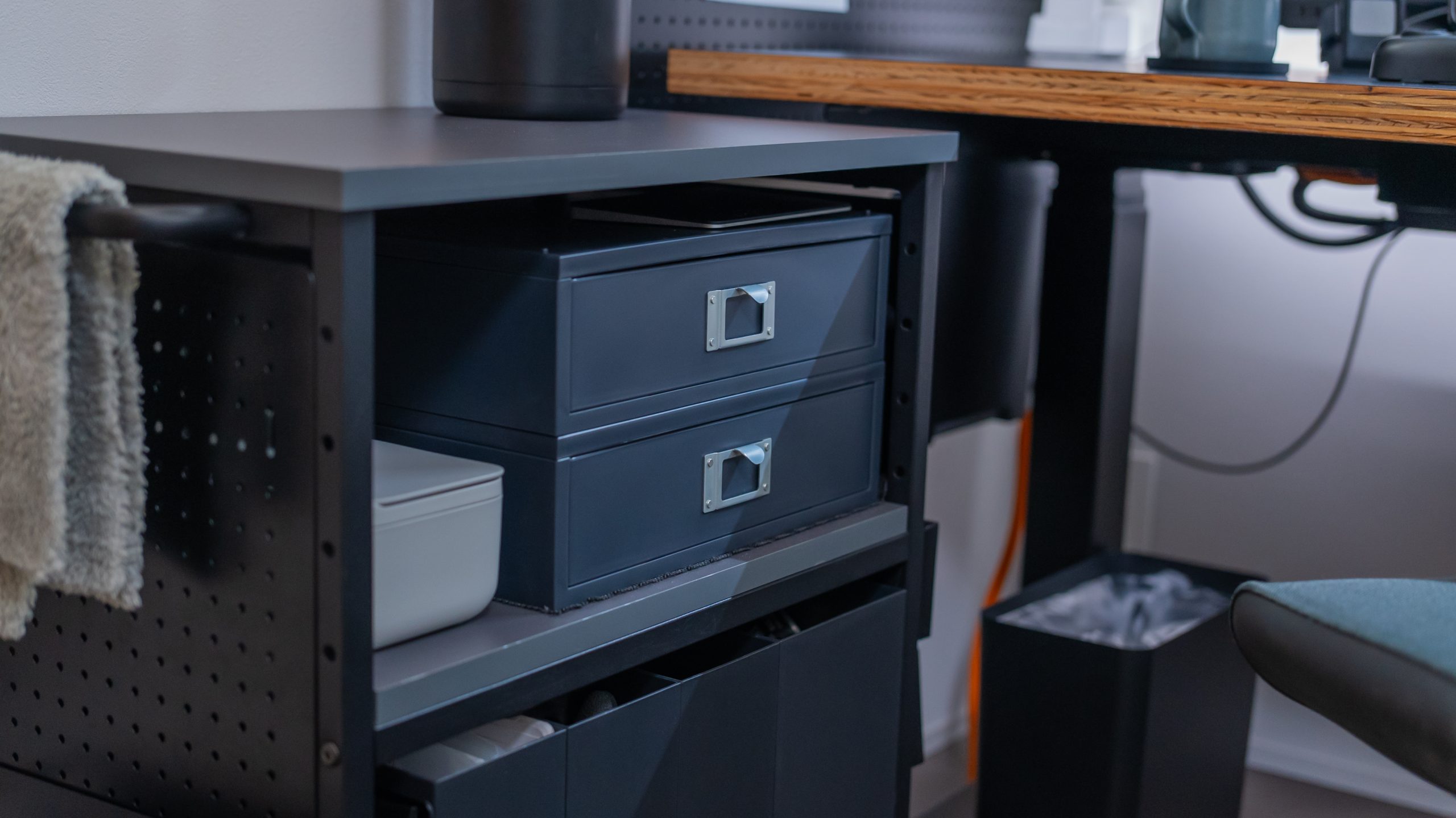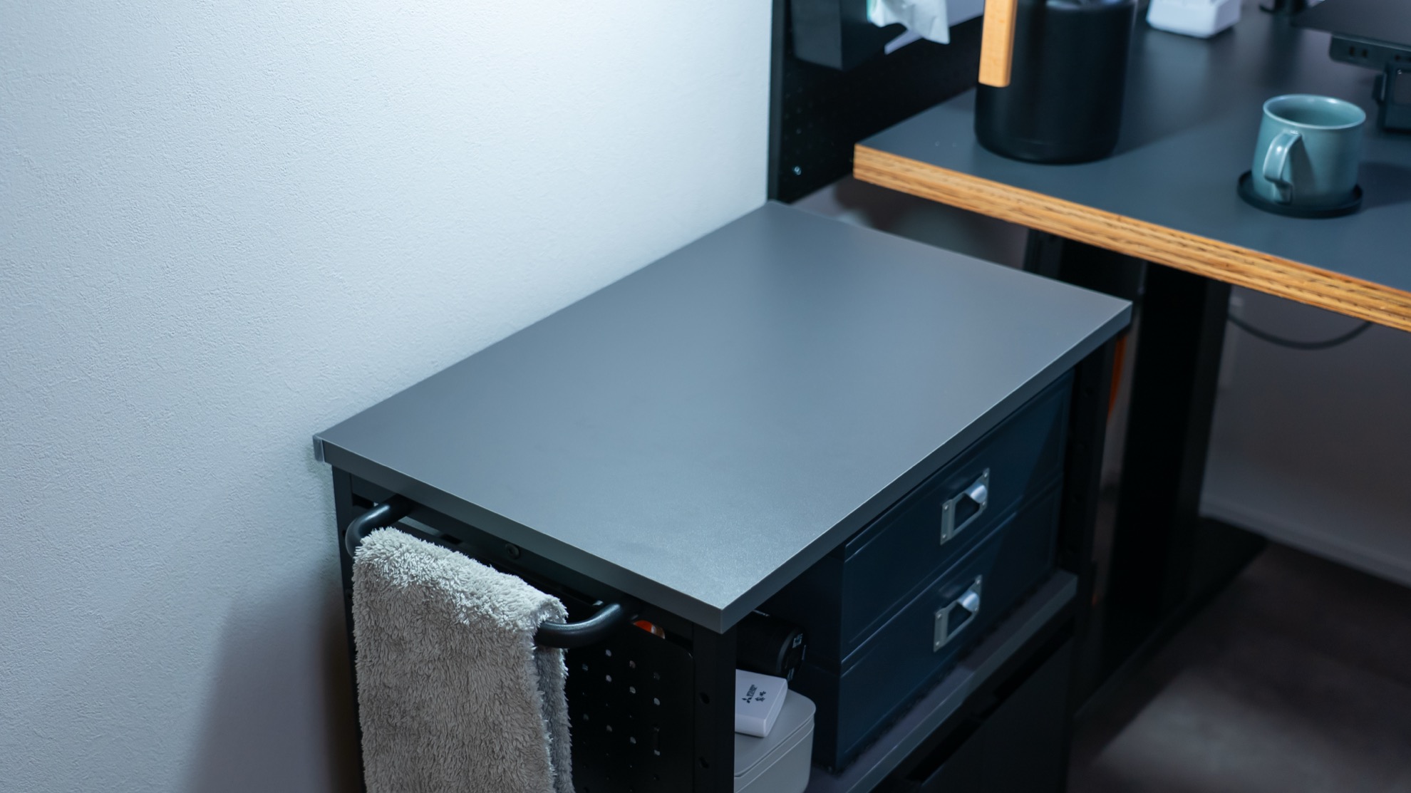 引き出しはライクイットのA4引出しを設置。まず僕のデスクの雰囲気に合わせて色は黒かグレーが良かったこと、そして次に紹介しますがライクイット引き出し専用システムトレーが販売されていて、引き出し内部も簡単に整理整頓できる点が気に入ってこちらをチョイスしました。取手が金属になっている点もまた無骨でお気に入りです。