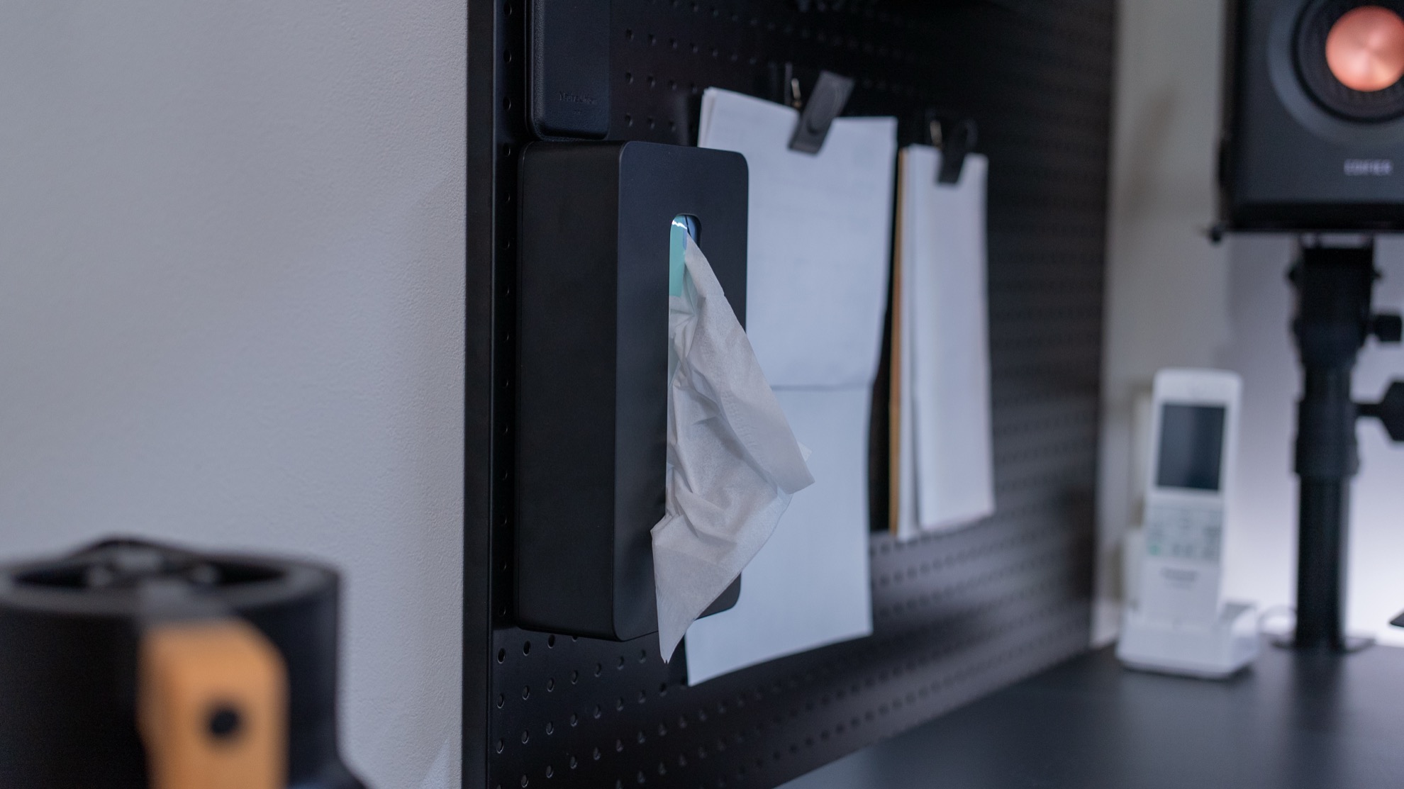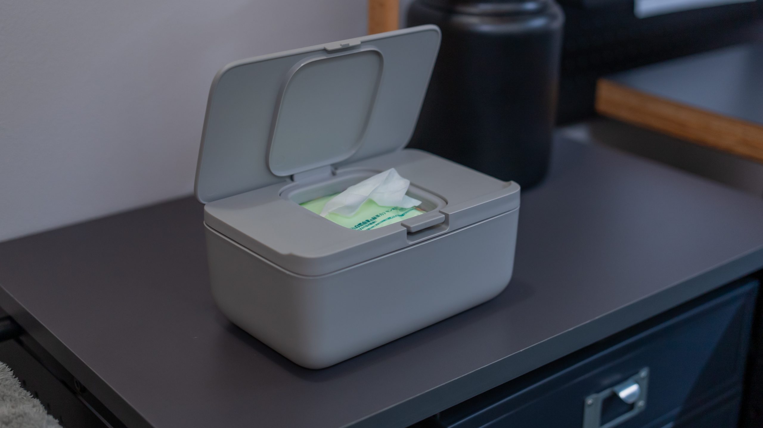キーボードなどデスク周りのガジェット類の掃除をするのに使っているウェットティッシュとマーナのケースです。