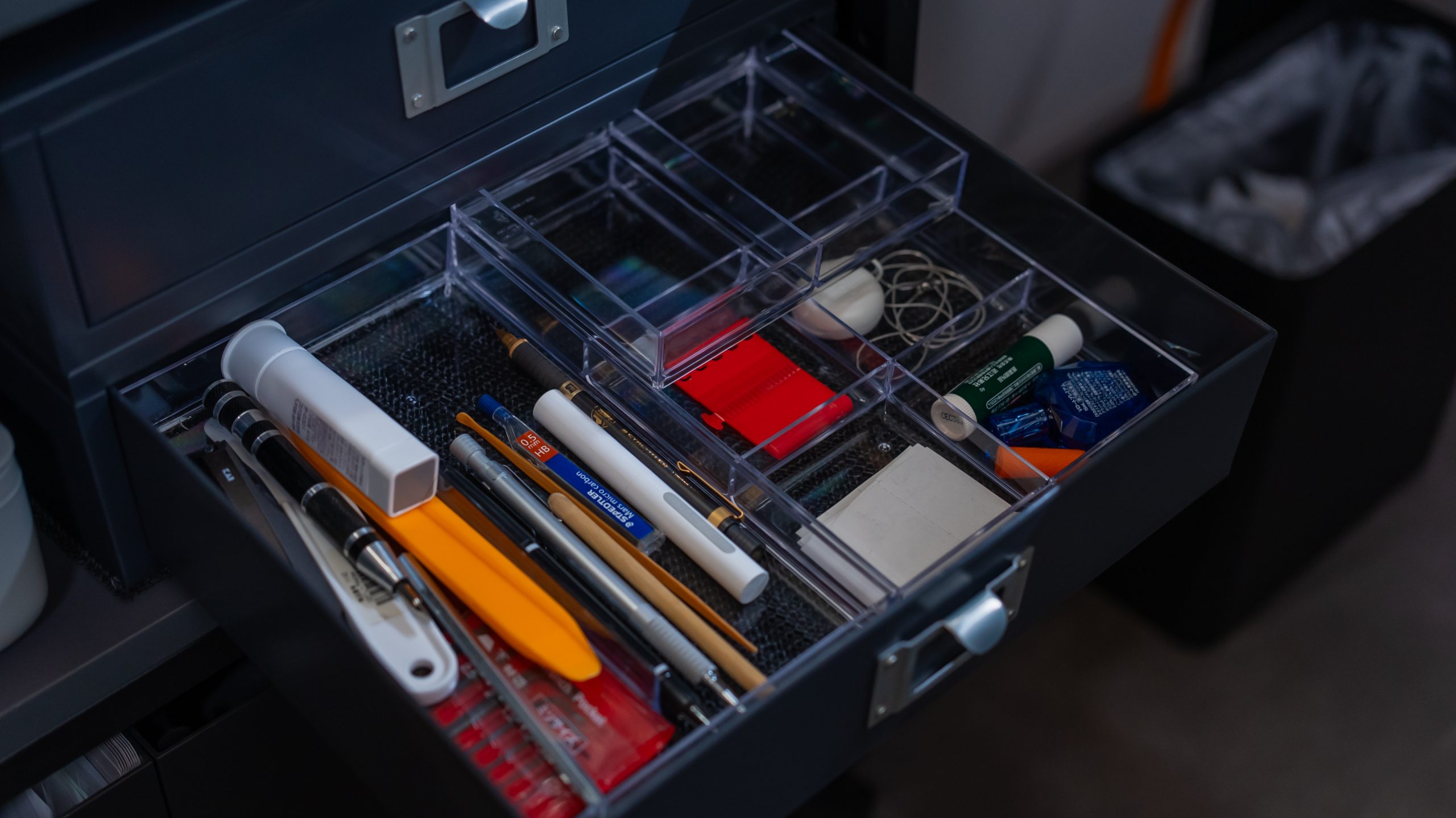 ライクイットの引き出し専用システムトレーです。サイズはA5とA6、さらに2分割・6分割・20分割の計6種類があります。僕が導入したMX-50Rという引き出しであれば、A5サイズであれば横並びで2つ入り、A6サイズだと4つ並べて使う事が可能。また、専用トレーは上下に重ねる事ができ僕はA6サイズを上部に重ねて使っています。簡単に引き出し内部も区切る事ができる引き出しと専用トレーでとても使い勝手が良いです。