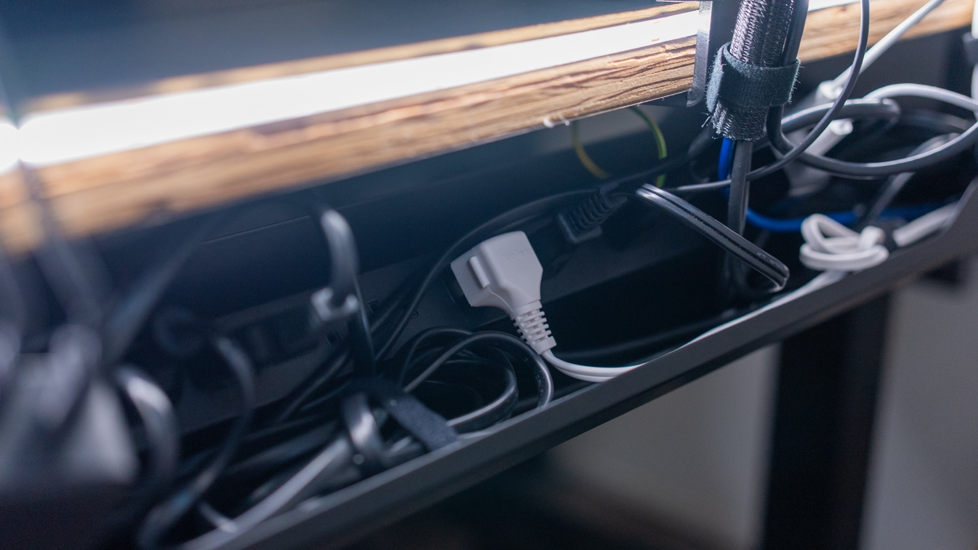 ケーブルトレーには、エレコム10口電源タップを設置しています。デスク上の全ての電源はこちらからとっています。また、スチールケーブルトレーと電源タップを固定するのにサンワサプライ電源タップマグネットをつけることで、ケーブルを抜き差ししてもズレなくなります。これは地味に良いです!