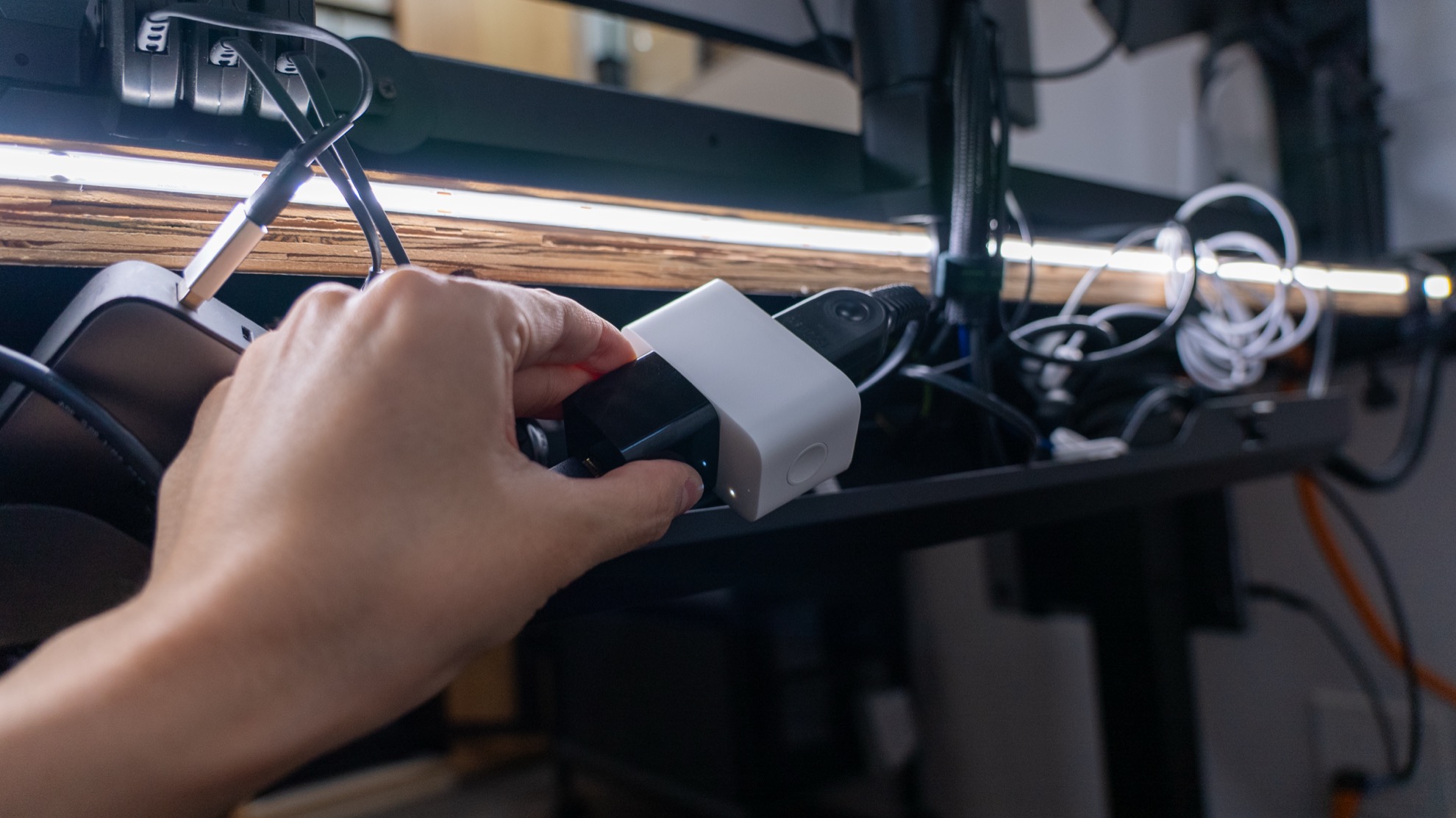 デスクに座ると自動的にデスクライトとデスク側面の間接照明が光るようにスマートプラグを配置。