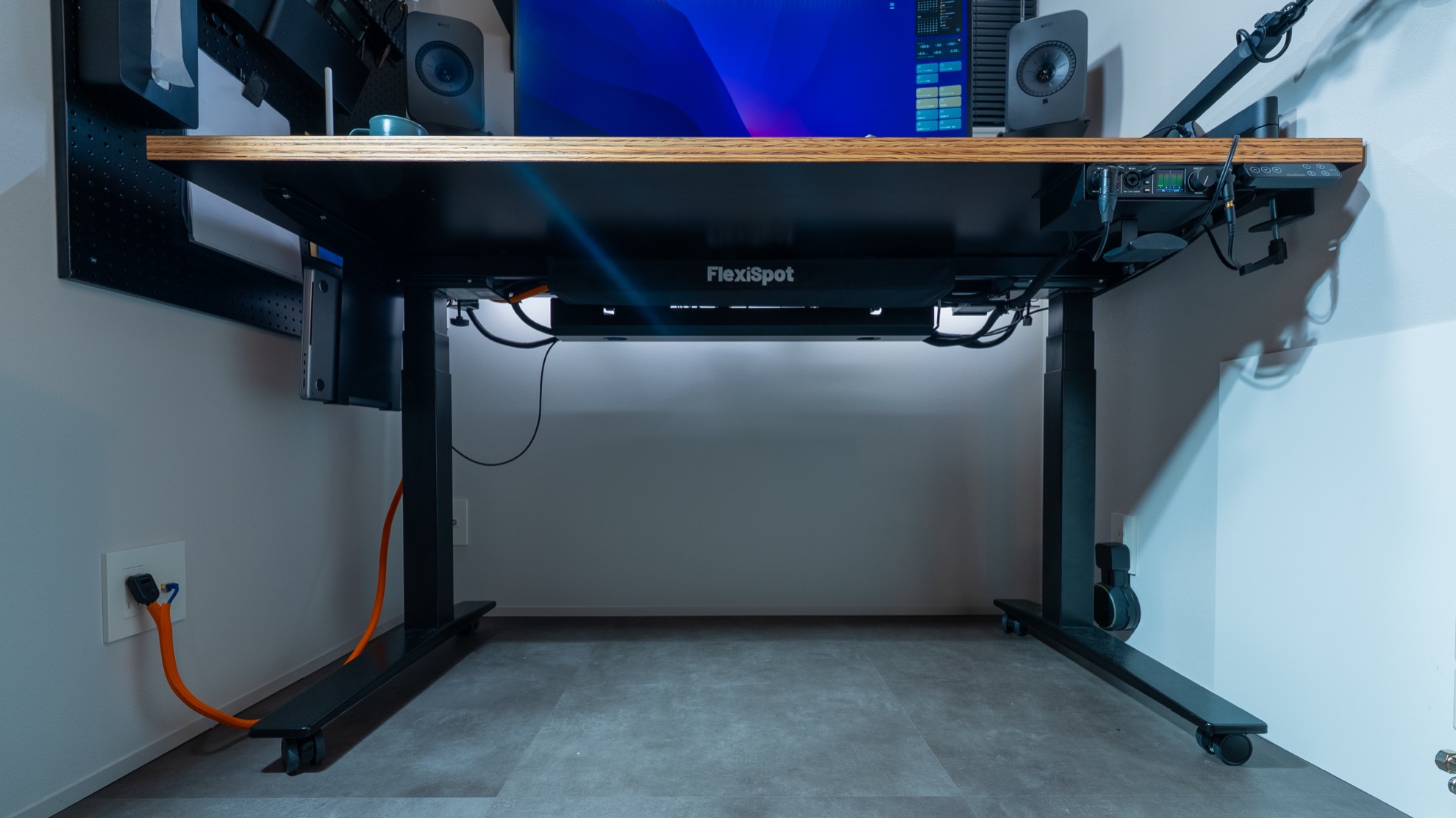 デスクフレームは、電動昇降デスクFlexiSpot E7H。コの型フレームのため足元が広く、耐荷重160kgとFlexiSpotの中でもTOP3に入るハイスペックモデル。個人的にはE7HかE7 Proがおすすめ!
