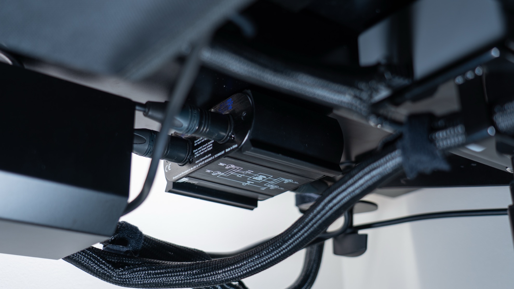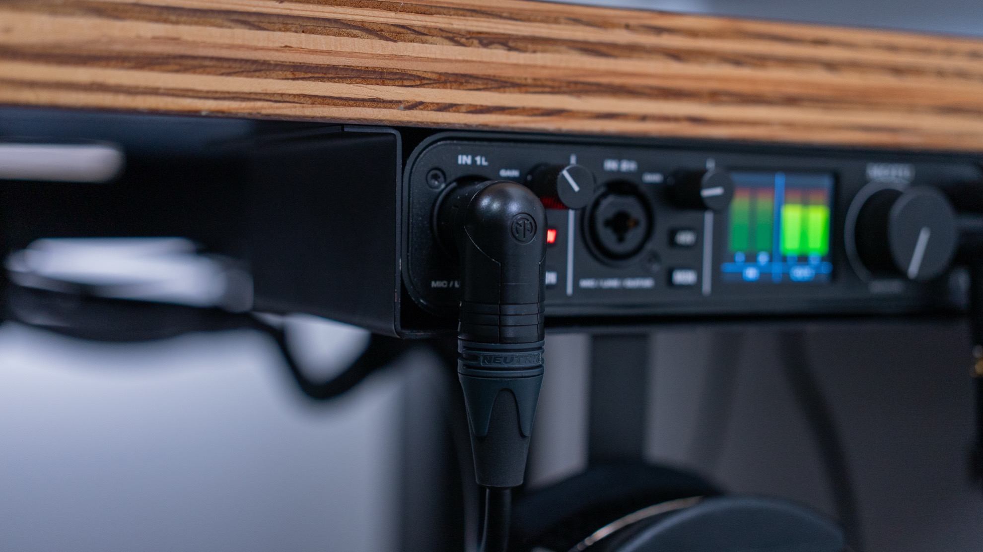 SM7B→プリアンプ→MOTU M2という流れで接続しているのですが、CANAREのXLRケーブルで接続しています。MOTU M2の入力端子部分にはL型端子のケーブルを採用して、こちらもケーブルの出っ張りを抑えています。
