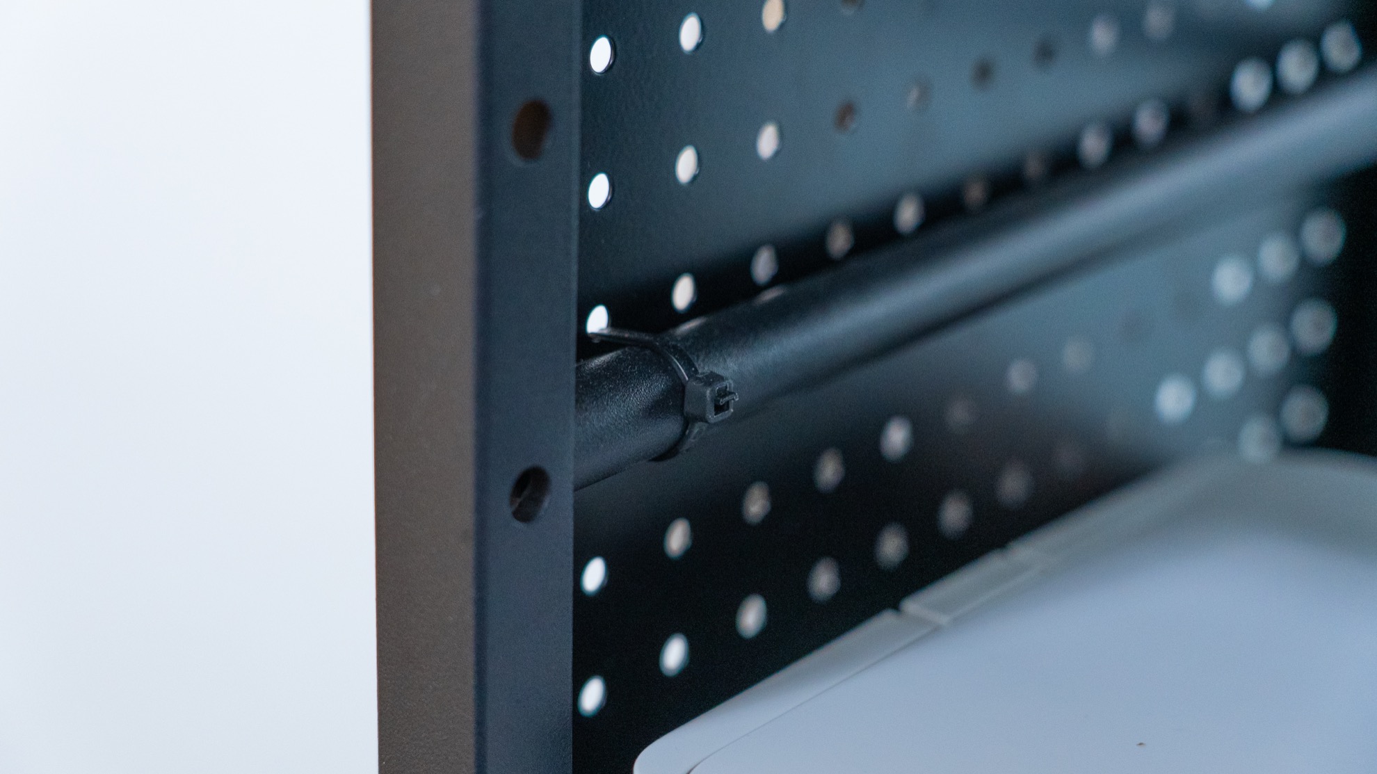 次にサイドにはスチール製の有孔ボードを設置。取り付けは、結束バンドで締め上げて固定するだけです。見た目が、無骨なサイドデスクになり、またマグネット吸着ができるようになるので様々なマグネット収納アイテムを取り付ける事が可能になり使い勝手も向上するのでおすすめのDIYです。サイズは、30cm×50cmを取り付けました。サイズのバリエーションが豊富なので購入時はサイズをチェック!