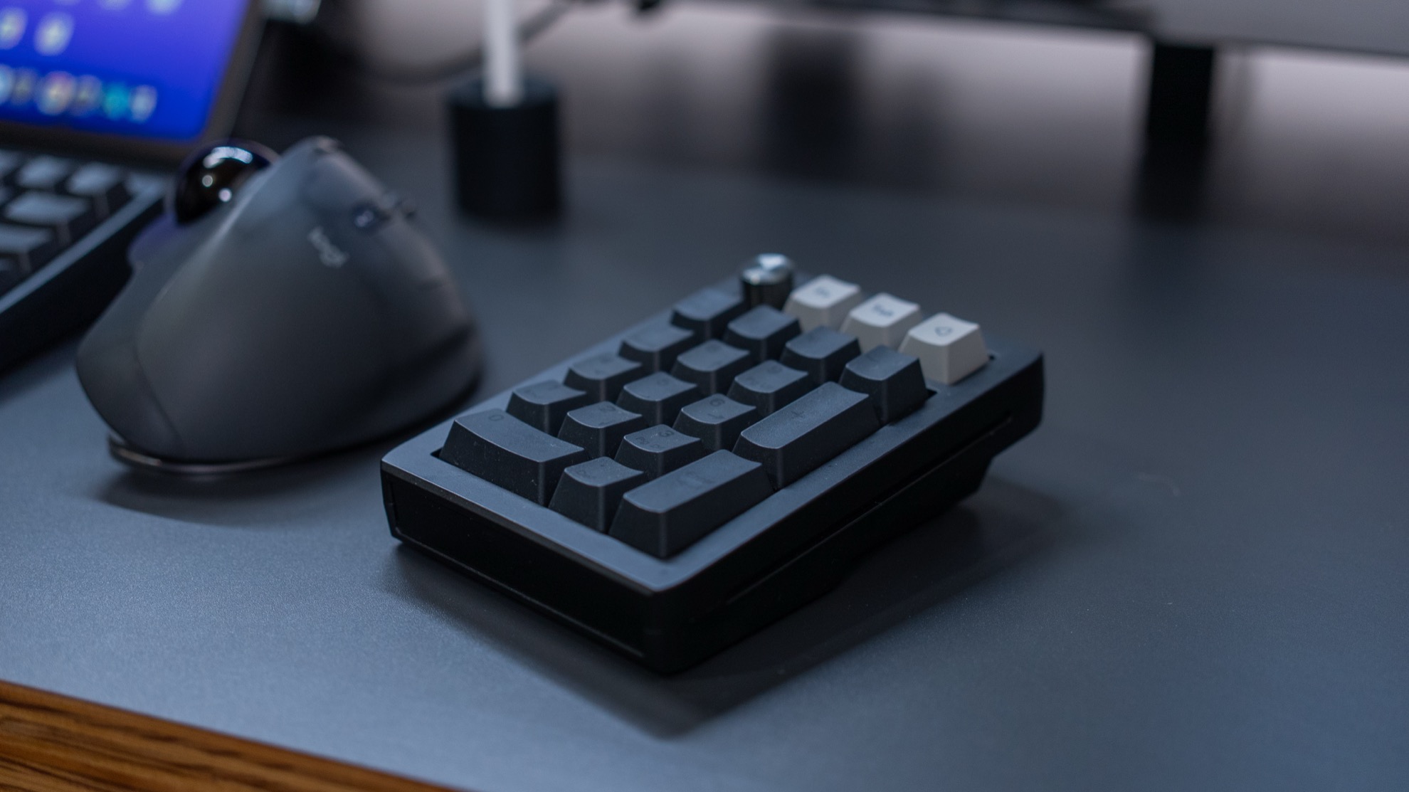 有線・Bluetooth・レシーバー接続が可能なテンキー。キーキャップ(アリエクにて購入したが現在は売り切れ)を変更して、HHKB風にカスタマイズしています。ダイヤルが1つ搭載しており、ワイヤレスヘッドホンやイヤホンの音量調整できる点が地味に良いです。
