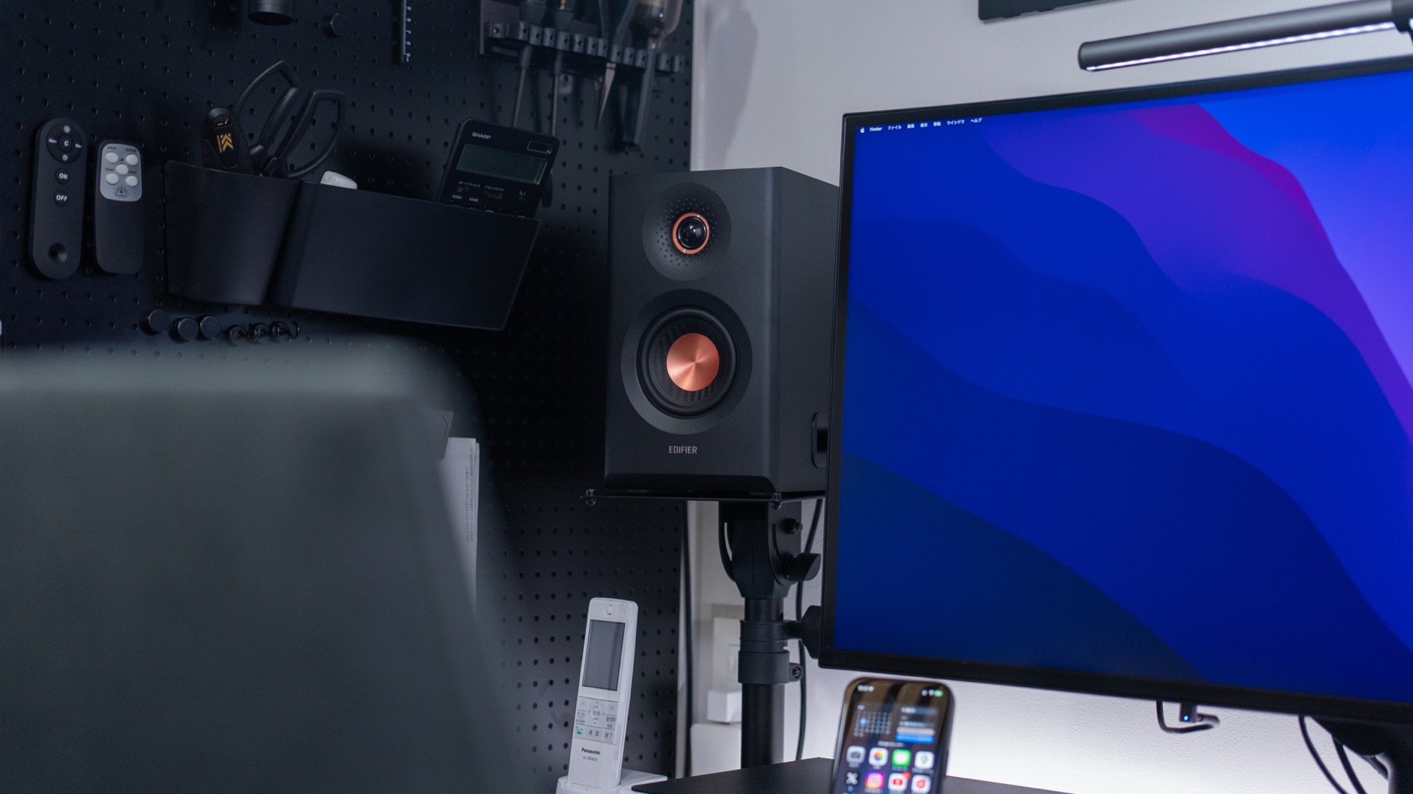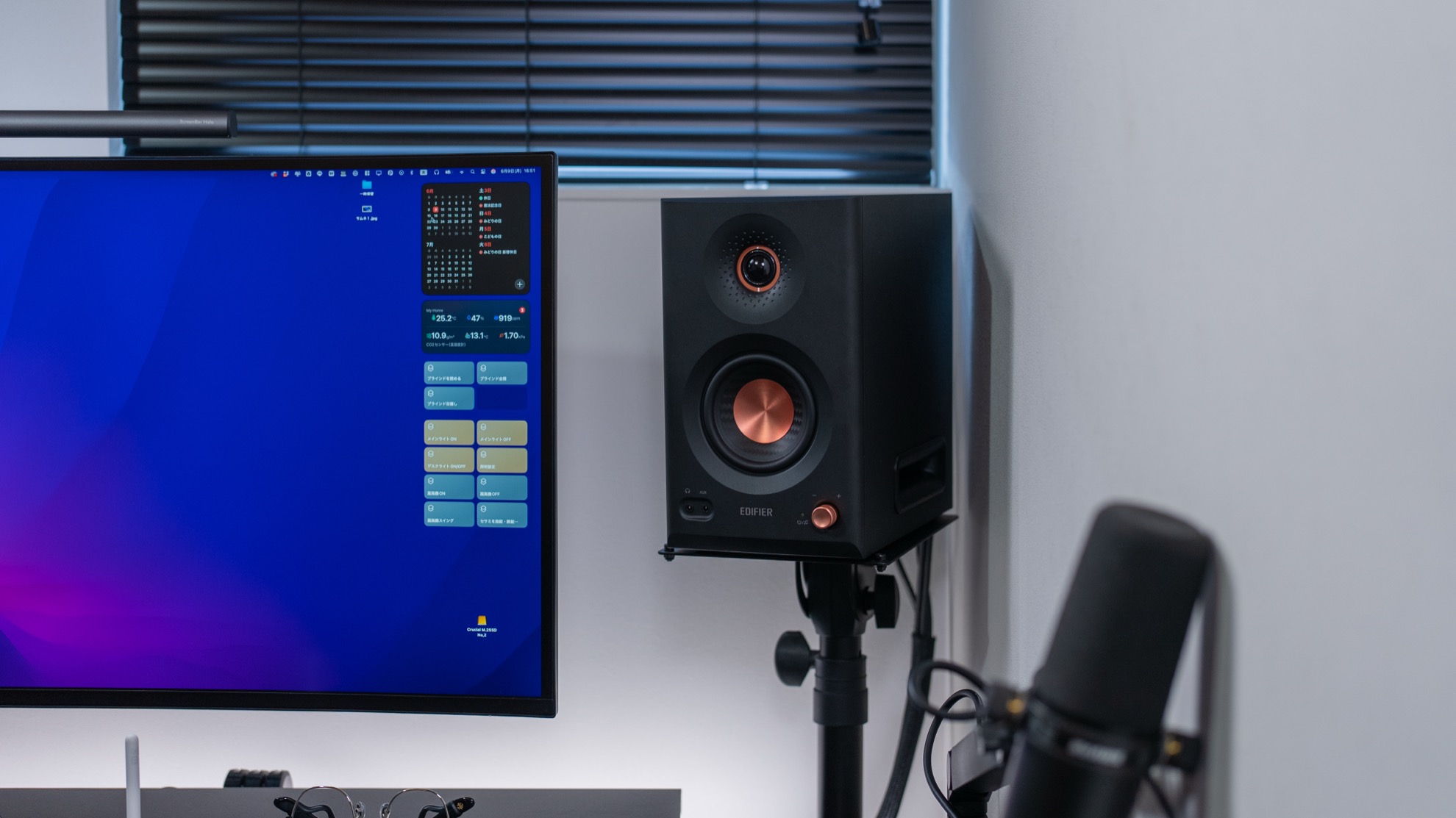 スピーカー本体のデザイン、音質、MOTU M2との接続性が気に入って2025年から使い始めたEDIFIER MR5。ウーファーも内蔵していて、低音の迫力がすごい、Bluetooth6.0のため無線でも音ズレがほぼない点もお気に入り。EDIFIERの中ではハイエンドモデルだけど、約4万円で購入可能でこのスピーカーは非常にコスパが良いです。ただ、とにかくデカいという点がネックです。ちなみに接続はクラシックプロのTRSケーブルを愛用しています。