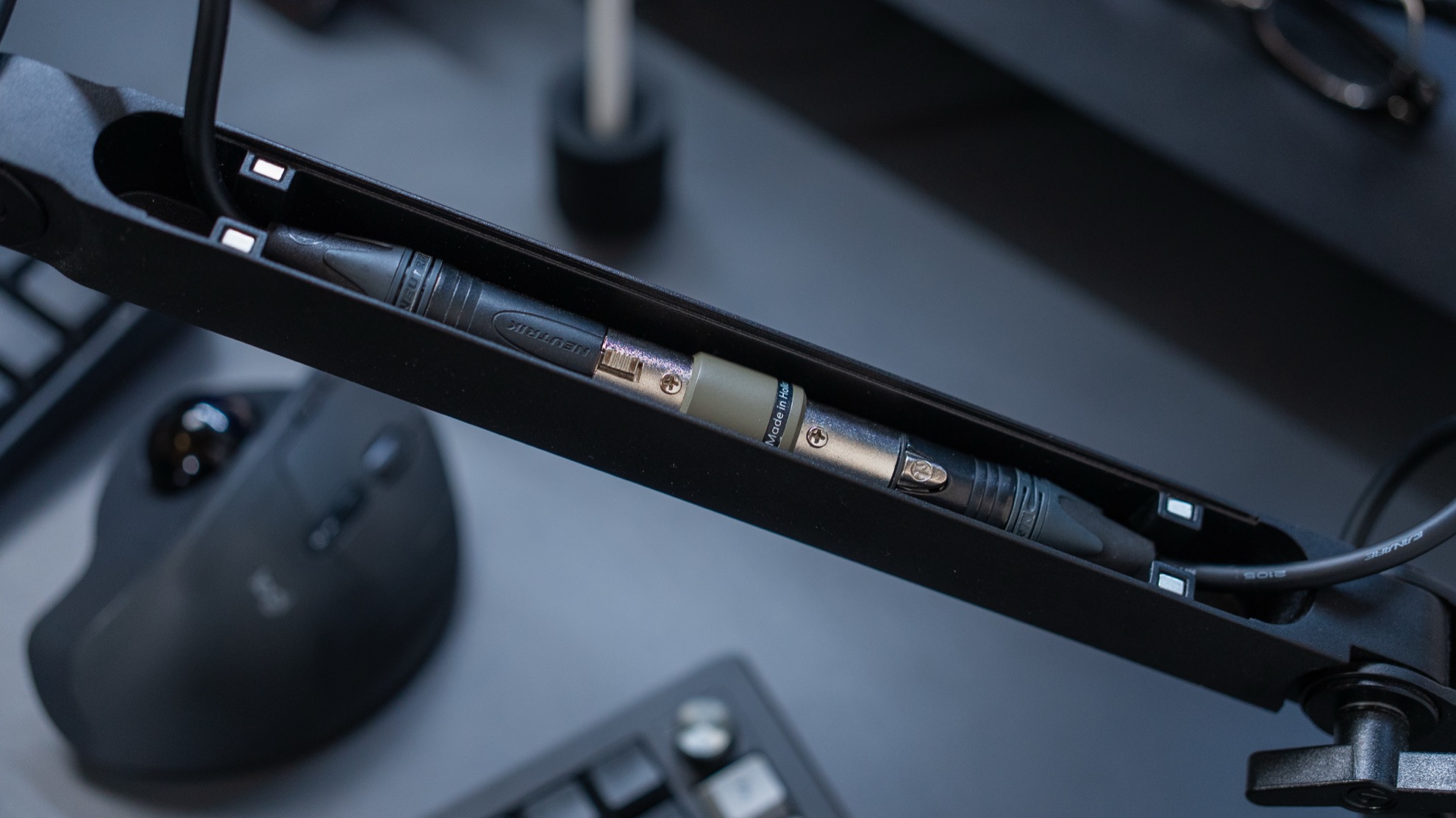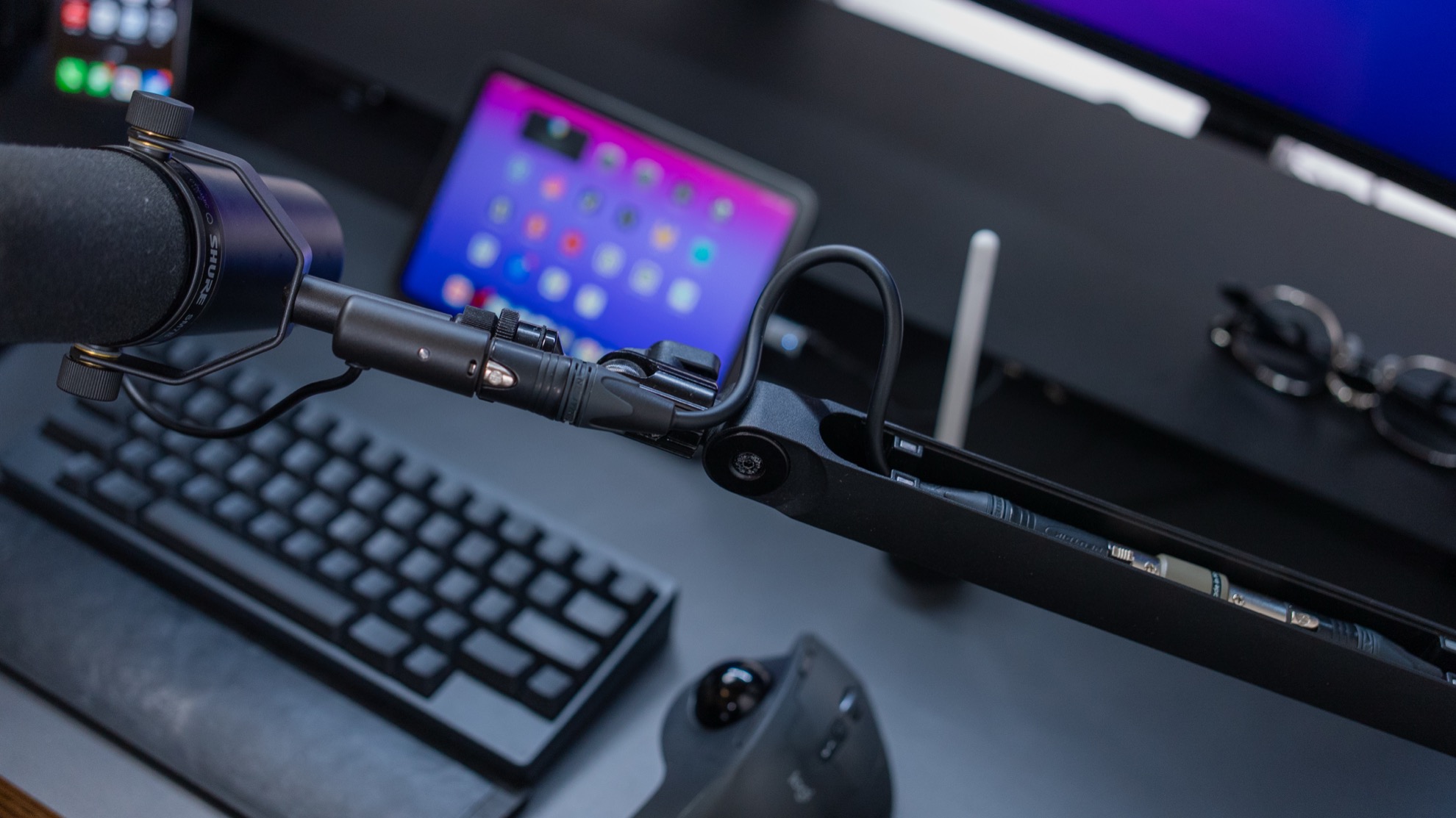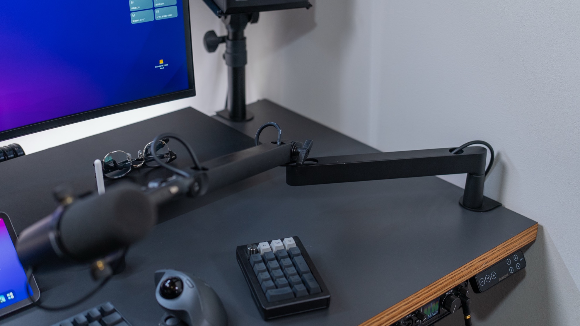 マイクアームも色々と使ってきましたがElgatoのマイクーアームがお気に入りです。低い位置からスライドして引き出すタイプで、モニター下に配置したり、画面への視界を遮らない点がとても良いです。