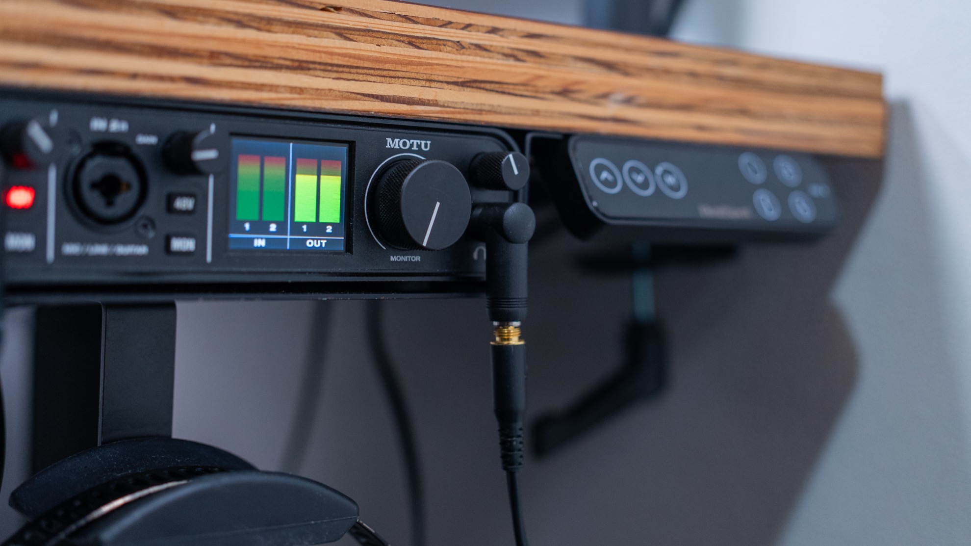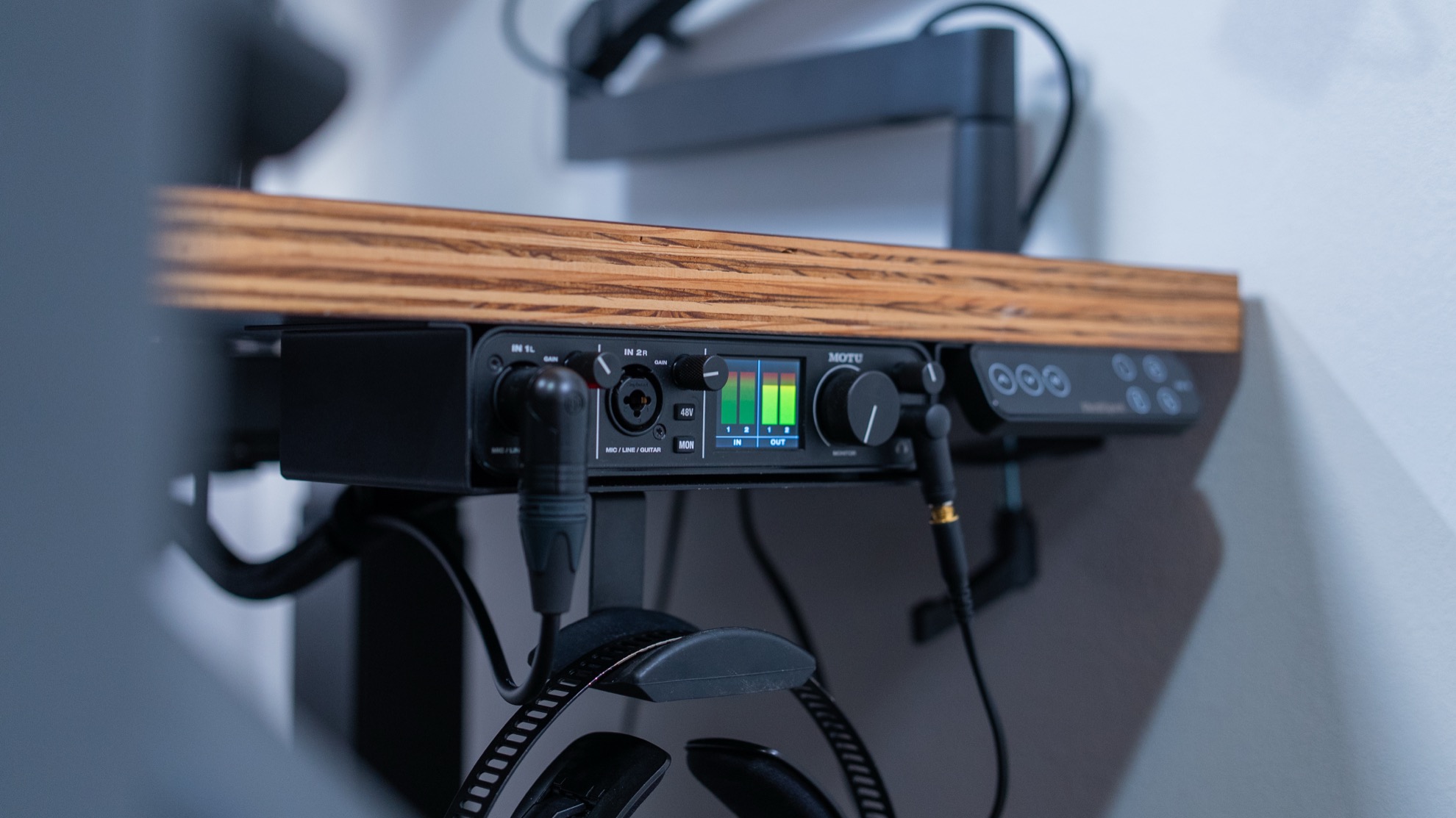 デスク周りのスピーカー・マイクを接続しているのがオーディオインターフェースMOTU M2。デザインのかっこよさ、そして内部に使われているDACは数十万円クラスのオーディオインターフェースに採用されているものと同じもので、その点を考慮してもとてもコスパが良いです。バランス接続でEDIFIER MR5で繋ぐ事が可能な点が相性が良いと思っています。