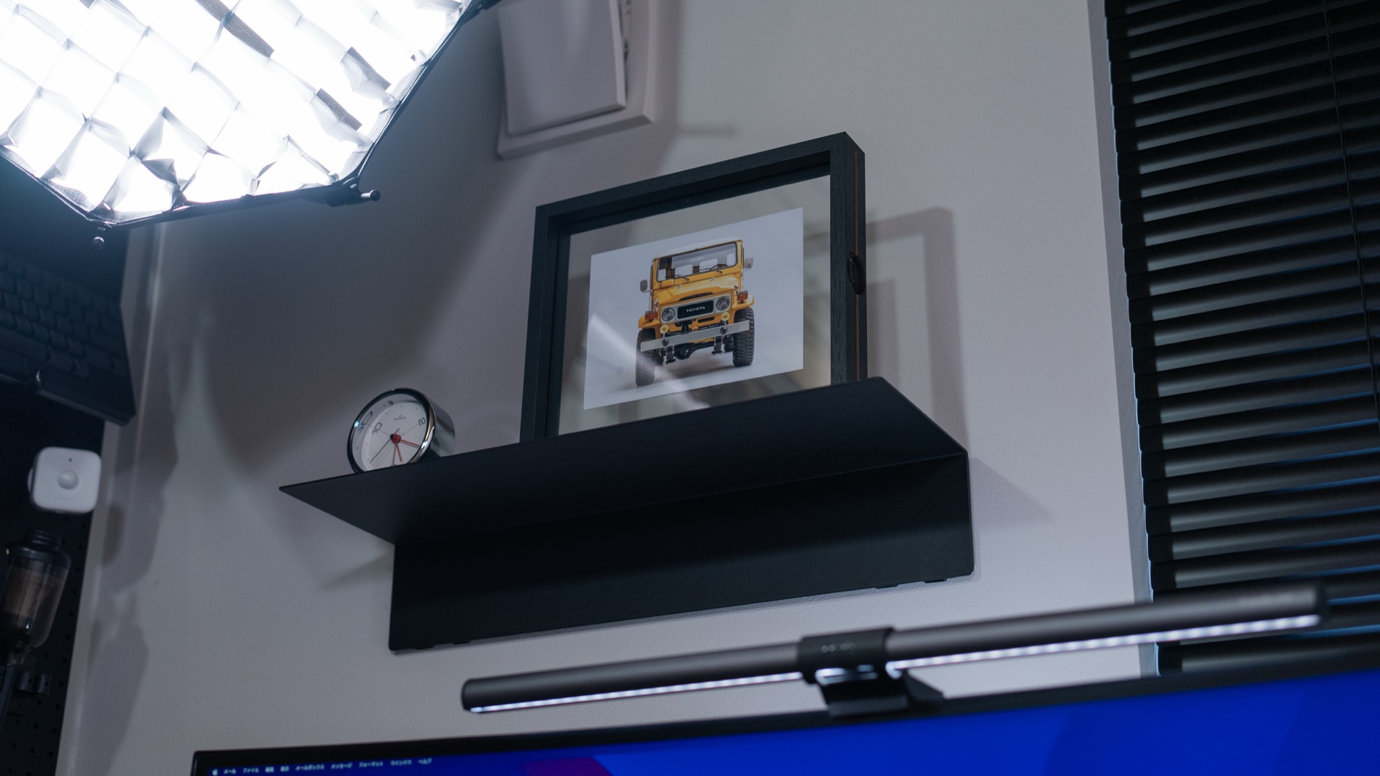 壁面が寂しかったので、スチール製の飾り棚を取り付けました。非常にシンプルな構造で、取り付けは石膏ボード用ピンで取り付けるタイプ。賃貸・持ち家関わらず取り付けできる点がとても良いです。また、シンプルでデザインも気に入っています。
