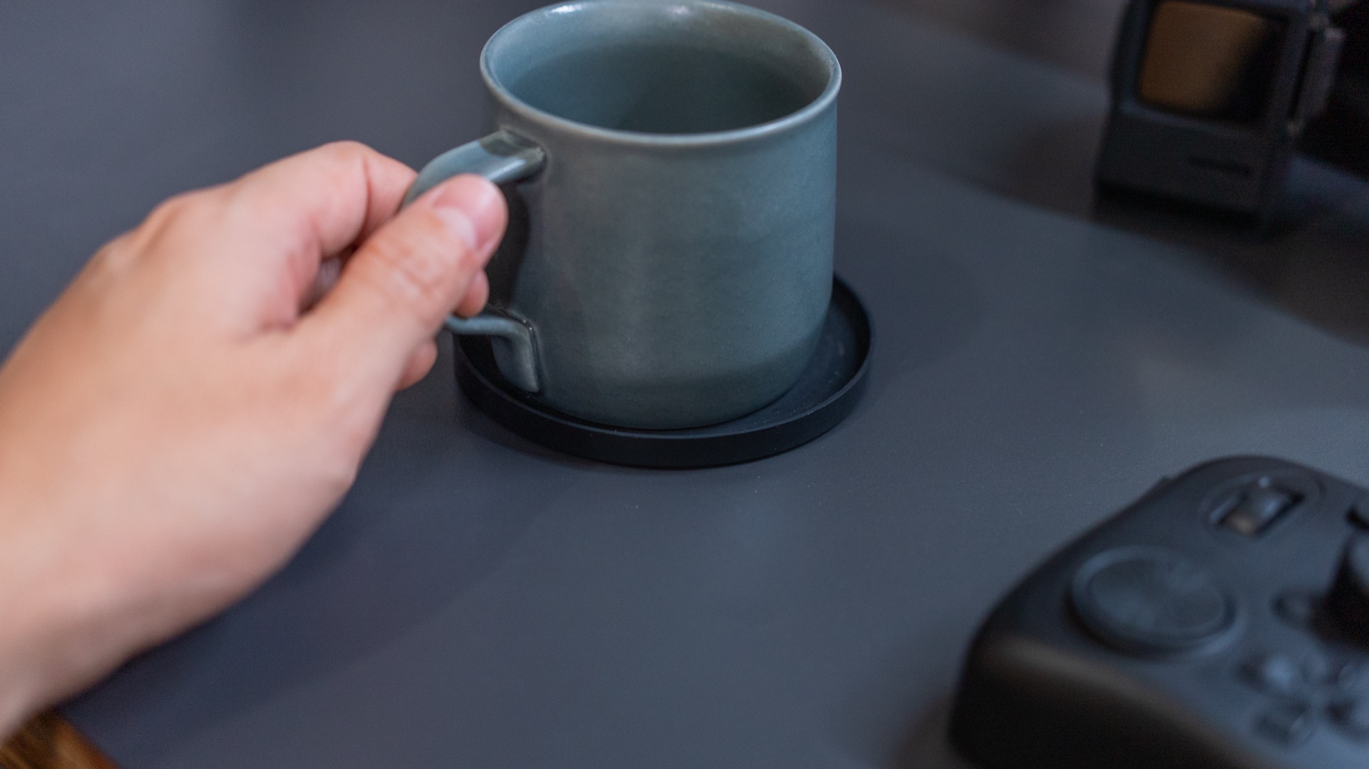 マグカップはKINTO。コースターは山崎実業のシリコンコースターです。シリコン製のコースターは、汚れても水洗いできる点がとても良いです。