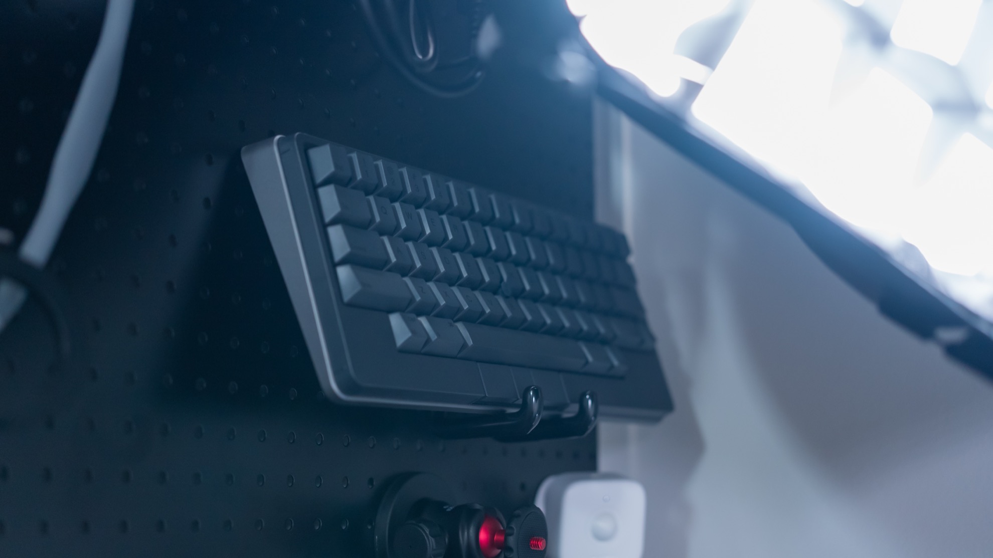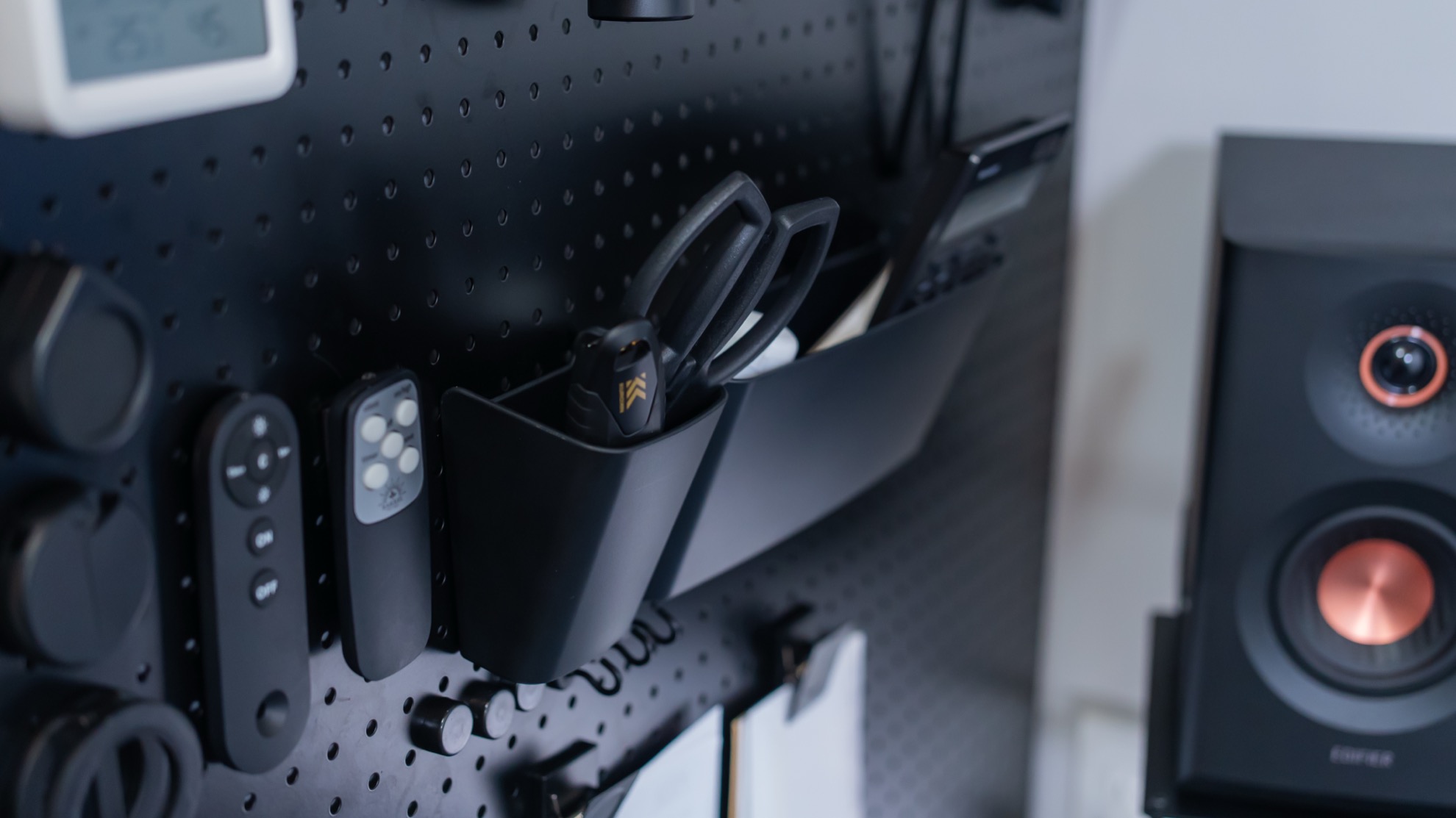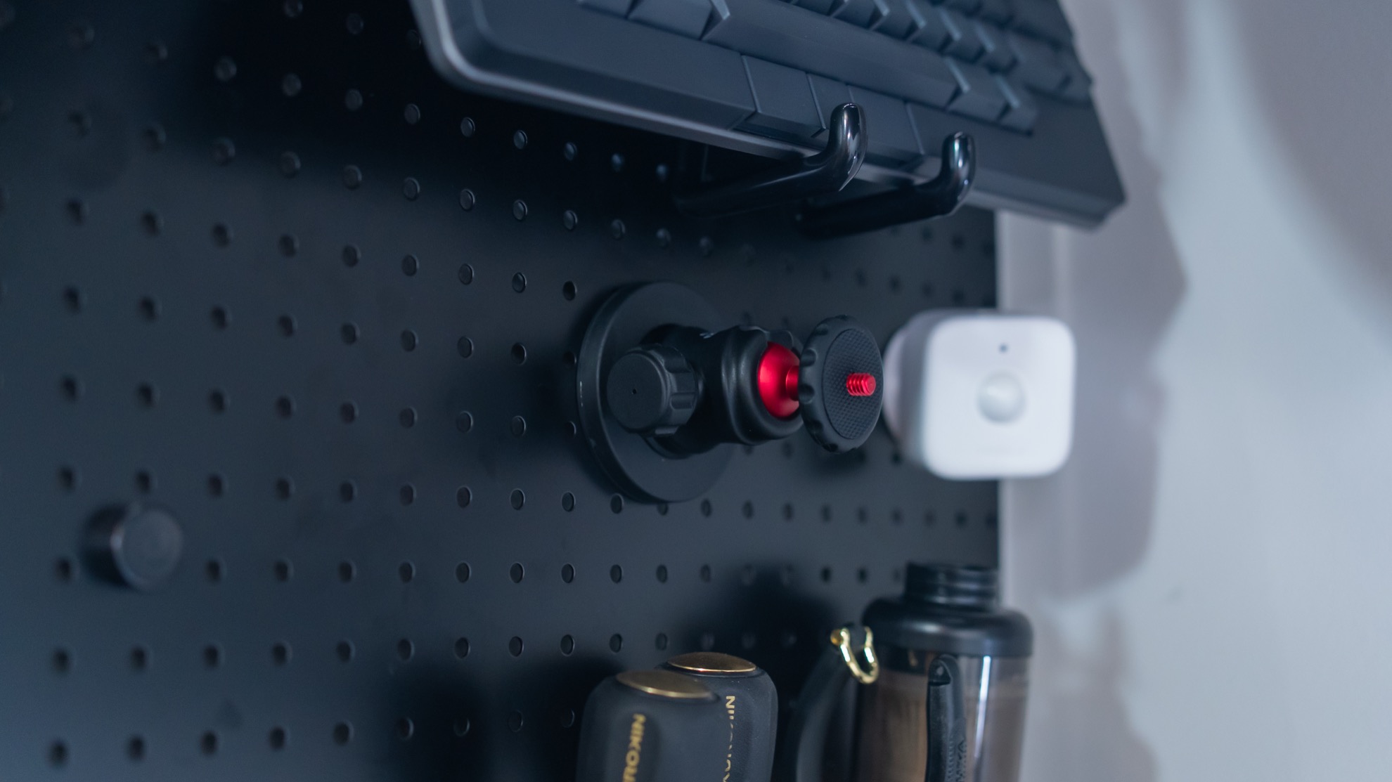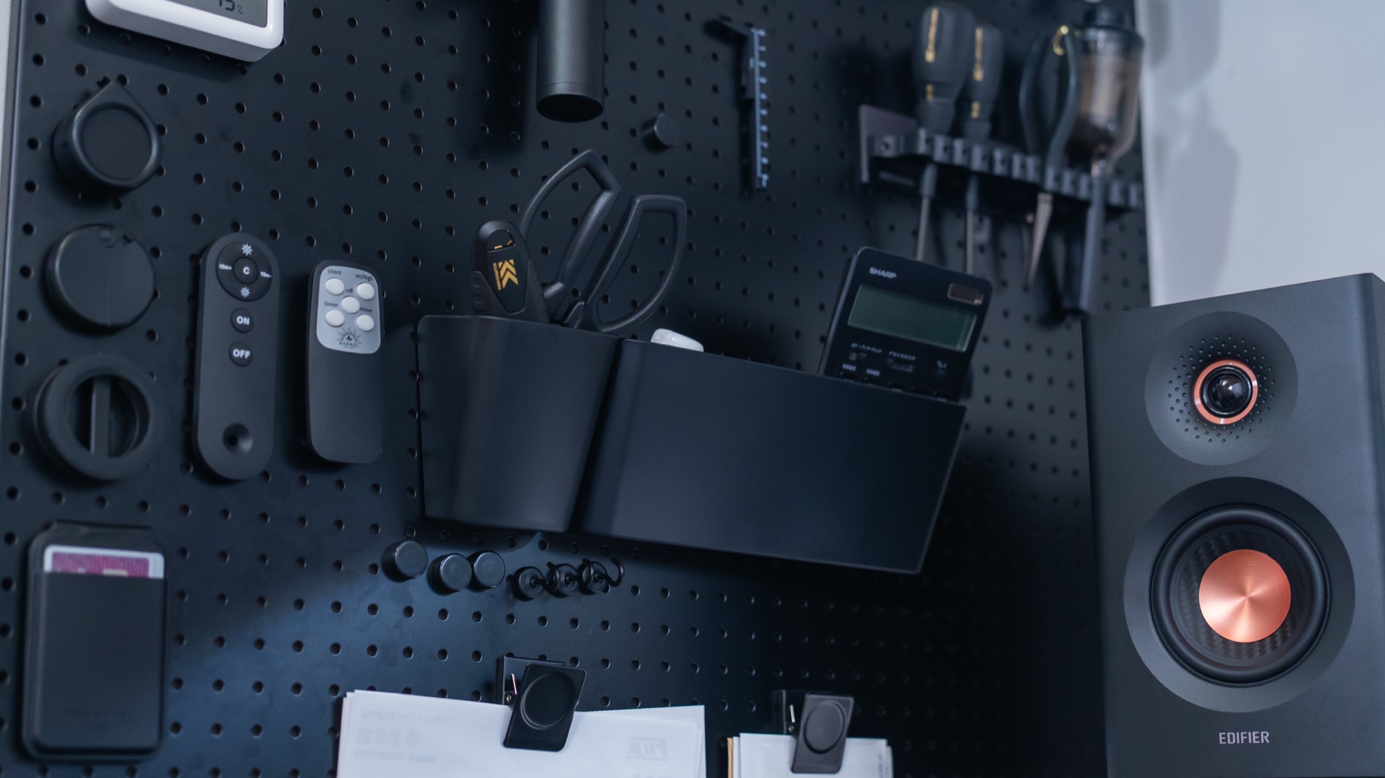 そして、デスクの横に150cm×80cmの巨大なスチール有孔ボードを設置し、壁面収納を作りました。スチール製の有孔ボードなのでマグネット取付が可能。マグネットシートなどを使えば、自分で簡単に収納アイテムをDIYできる点がとても良いと感じています。こちらも購入の際はサイズがたくさんありますので、その点は注意です。実際に僕が壁面収納しているアイテムは次に紹介していきます。