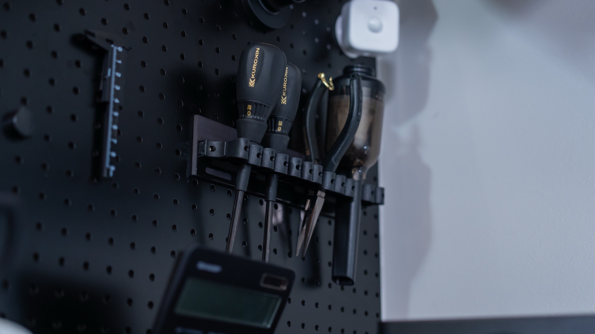 デスクいじりでは頻繁に工具を使用するので、よく使うドライバーとラジオペンチをを備え付けています。こちらのツール収納もマグネットで取り付けが可能です。