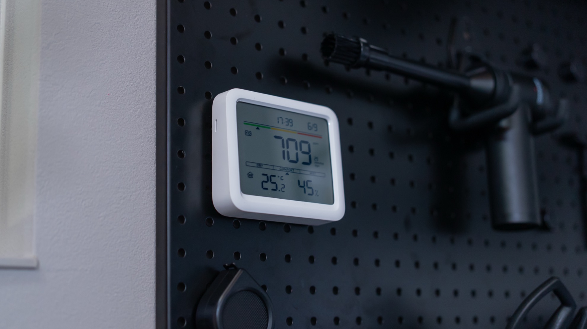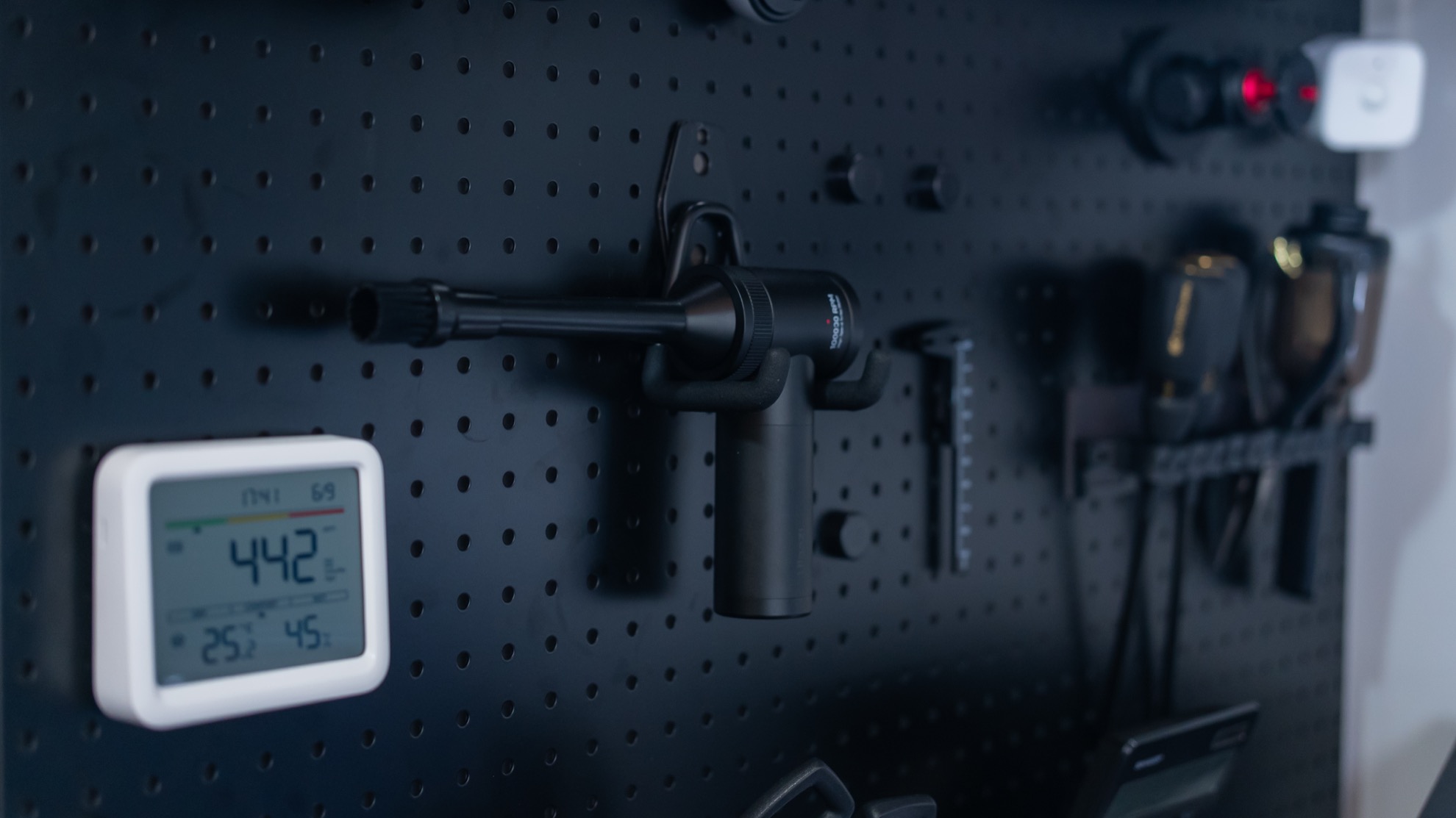 CO2濃度が高まると集中力が低下するという研究データがあるとのことで導入しました。また3畳と狭い空間なので閉め切っているとすぐにCO2濃度が上昇してしまうので、換気の目安にしています。またCO2濃度が2000を超えると自動的に天井につけたサーキュレーターが自動電源ONになるので、サーキュレーターがついたら窓・ドアを開けるようにしています。