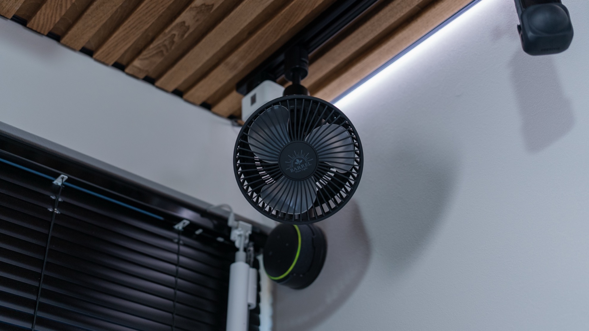 僕の書斎は3畳と狭い空間で、もちろんエアコンもついていません。また扇風機を床に置きたくなかったので、ライティングレールから電源をとることが可能なこちらファンを購入してつけています。扇風機として十分な風量が出て、見た目も良くて気に入っています。多少、ファンの音はしますが僕は気になりません。ファンの電源を取るためのソケットはこちらを愛用しています。