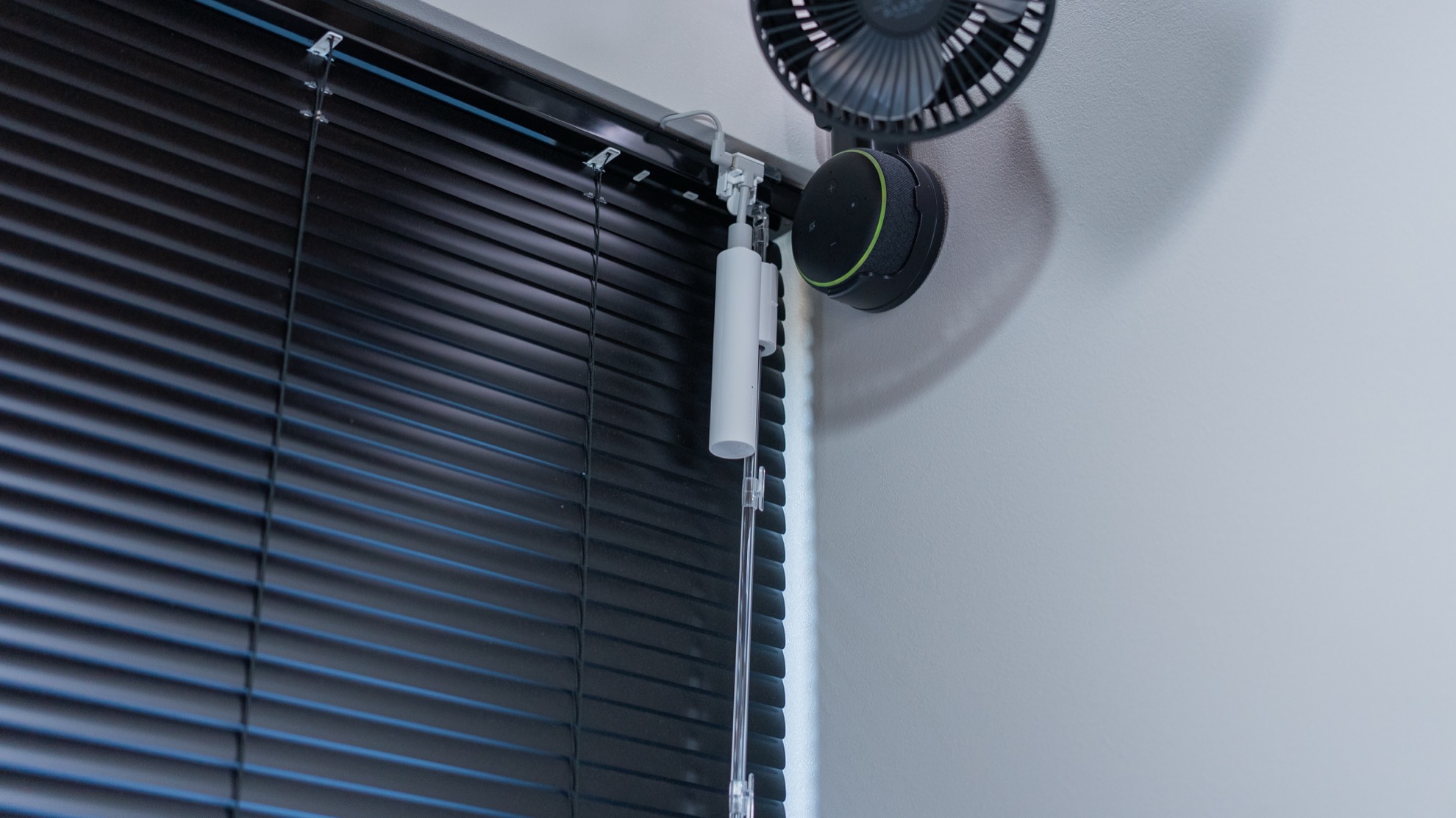 書斎は黒のブラインドを採用しているのですが、こちらも自動化のためにSwitchBotブラインドポールを設置。朝は自動的に全開になり、夜6時になると自動で閉めてくれます。ブラインドの開閉もPCからできるようにしていて、これまた便利です。