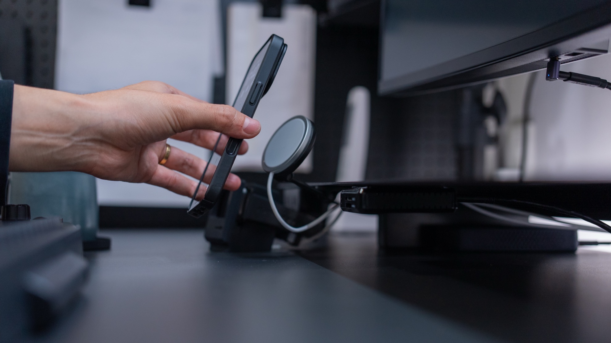 Apple純正MagSafe充電器をスタンド化するのに使っているのが、MaGdget Stand。これは2つのMagSafeマグネットからなるスタンドで、磁石がくっつく場所であればどこでも設置する事が可能です。また左右・縦方向の角度調整も簡単でとても使いやすいです。マグネットなので、外したいときも簡単に外せます。