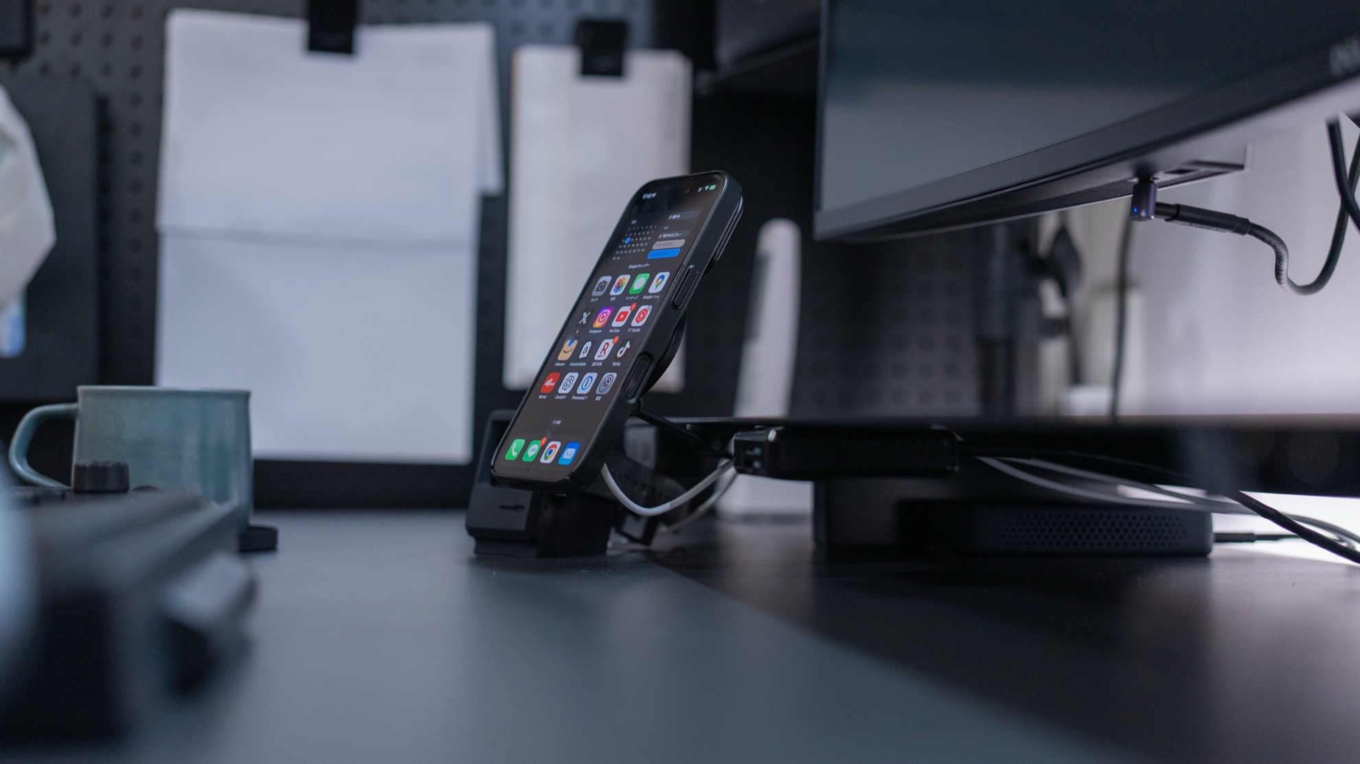 デスクで絶対必要なのがスマホ充電器兼スマホスタンドですよね?僕はApple純正充電器を充電器兼スタンドとして愛用しています。簡単に充電できて、通知もすぐにチェックできる。シェルフに設置することで操作性も良いです。