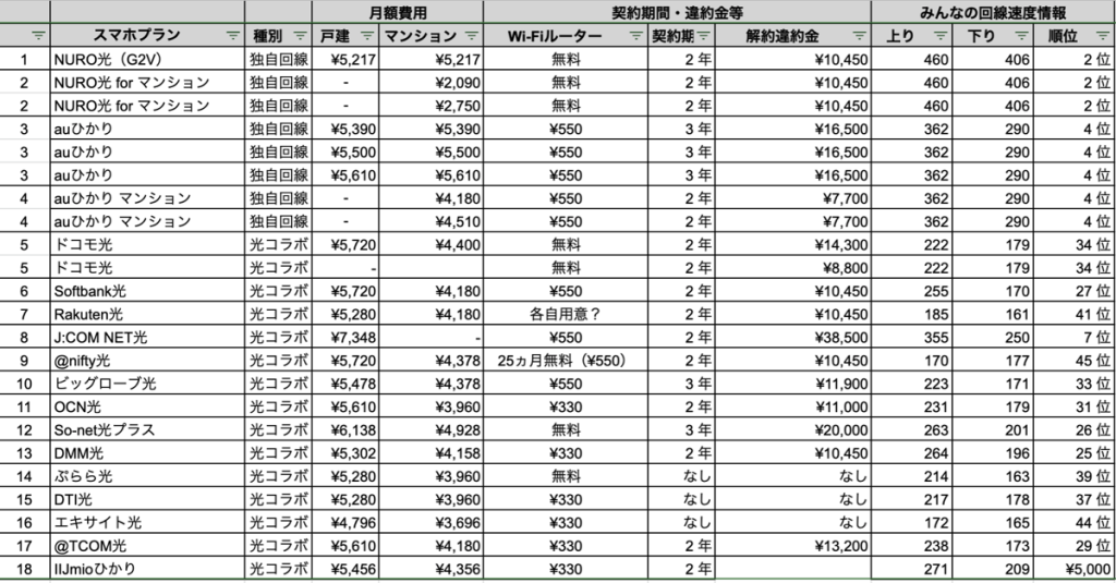 NURO光は戸建て・マンションタイプともに全18社と比較しても価格が安く、速度も速く、コスパ最強の光回線です!