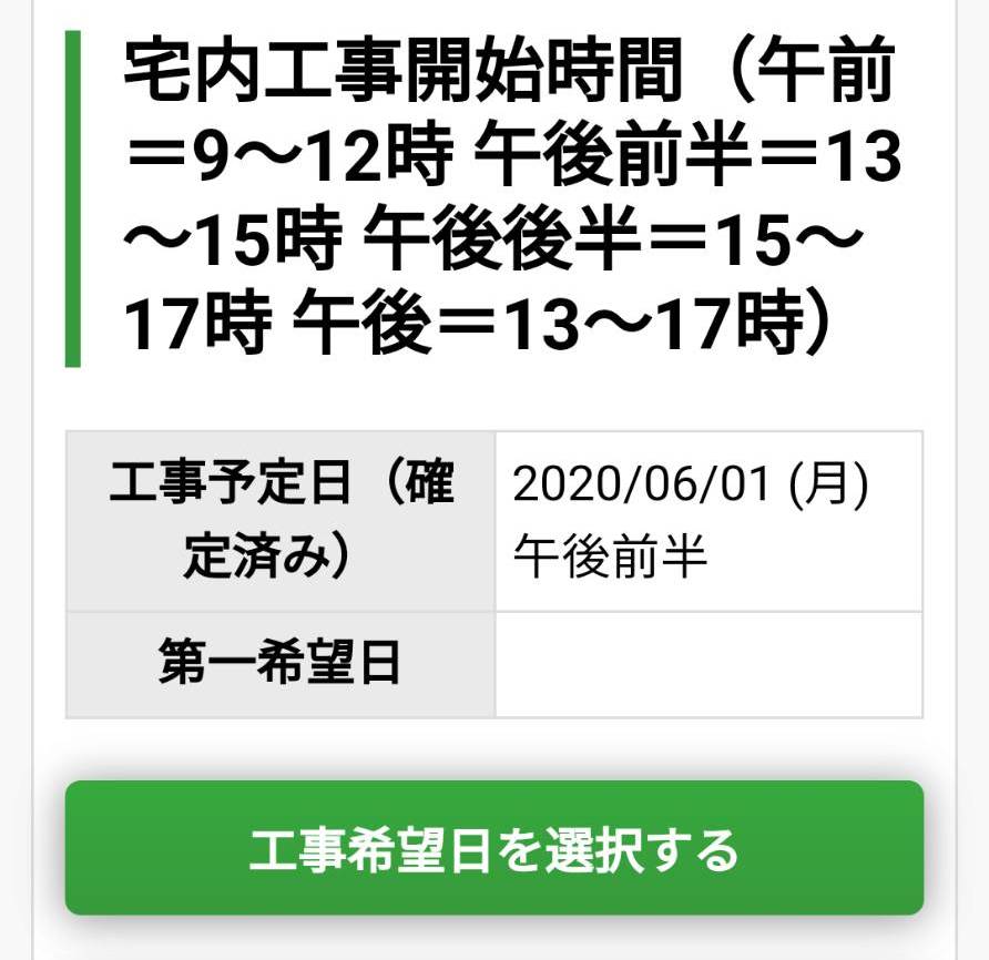 ちなみに、宅内工事が完了してもすぐに屋内工事の予約ができないケースがあります。実際に私はこのパターンでした。その場合は、屋外工事の日程予約フォームが送られてくるまで待つしかないです。