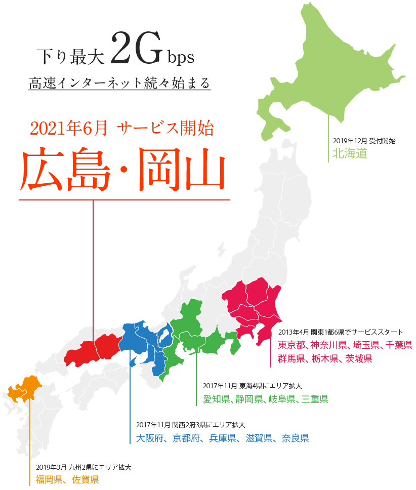 具体的には北海道、関東、東海、関西、九州の一部のみの対応となっていて、日本全体で見るとまだまだ対応していないエリアが多く目立ちます。