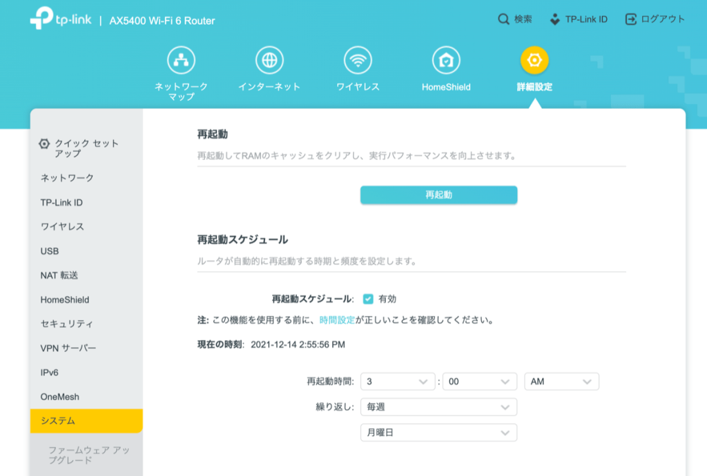 ちなみに私が利用しているTP-Linkには再起動スケジュール機能もついています。それだけ再起動が大事だということです。