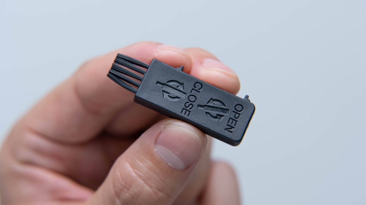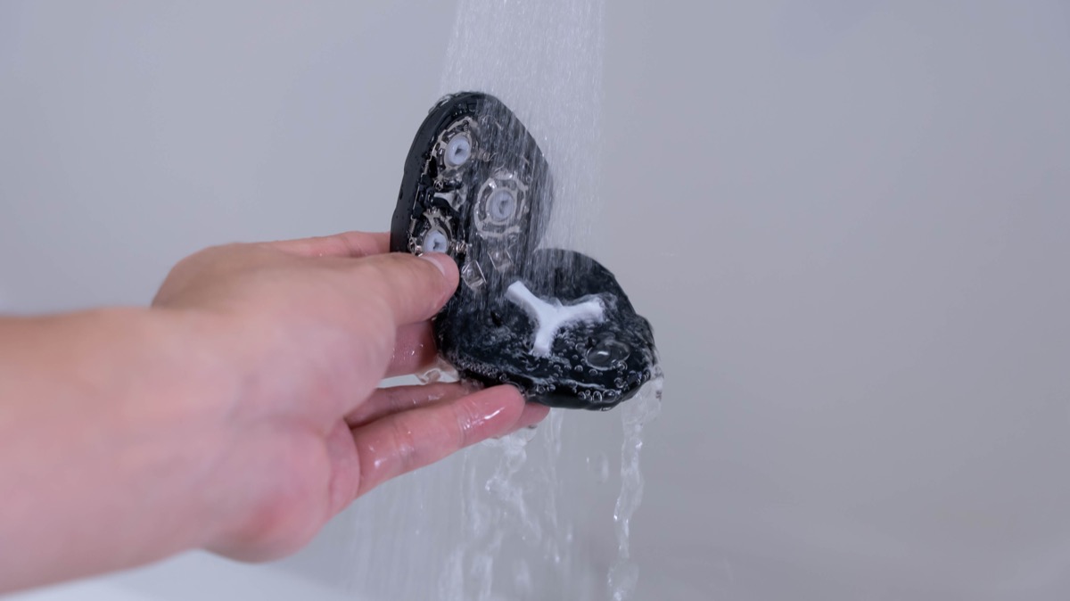 シェーバー部分の手前には開閉ボタンがあります。こちらを押すと、シェーバーの蓋が開閉し、髭を洗い流すことができます。